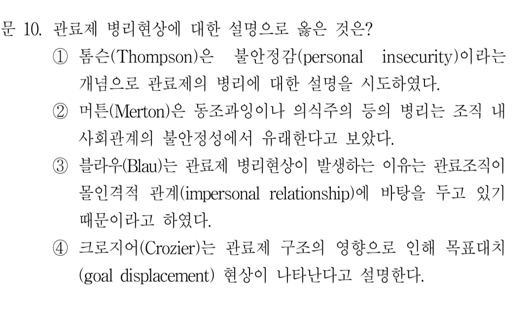 2019년 국가직7급 인사조직론입니다. 3번이 너무 헷갈려서 교수님의 기필고를 찾아봤는데 블라우&톰슨 : 개인 심리의 불안정성이 병리(권위주의 행태 또는 변동에의 저항)의 원인(인간적 유대 저해) 라고 되어있더라구요! 그러면 몰인격적 관계(인간적 유대 저해)=결과, 개인 심리의 불안정성=원인 이라 틀린 지문이라고 이해하는게 맞는지 궁금합니다!