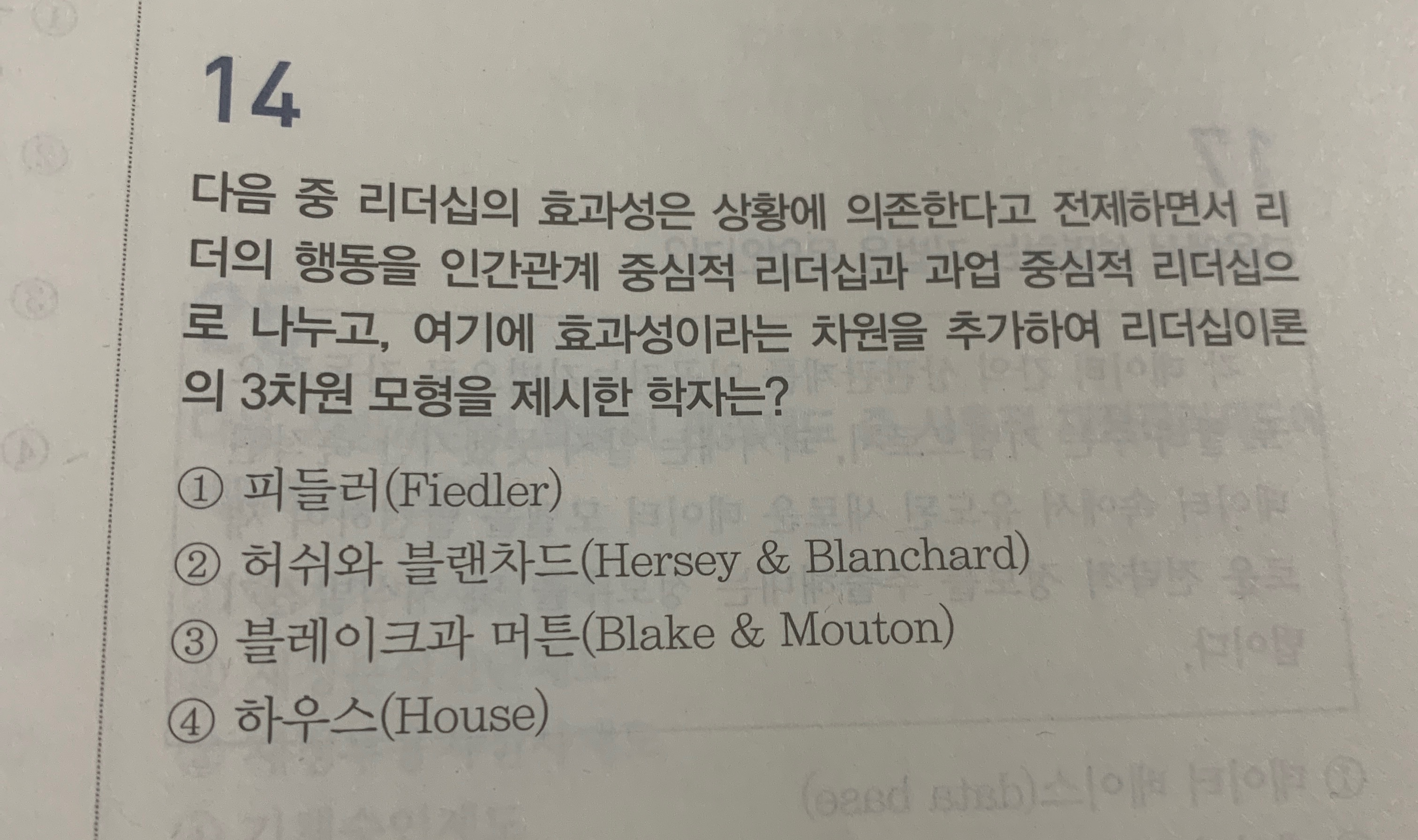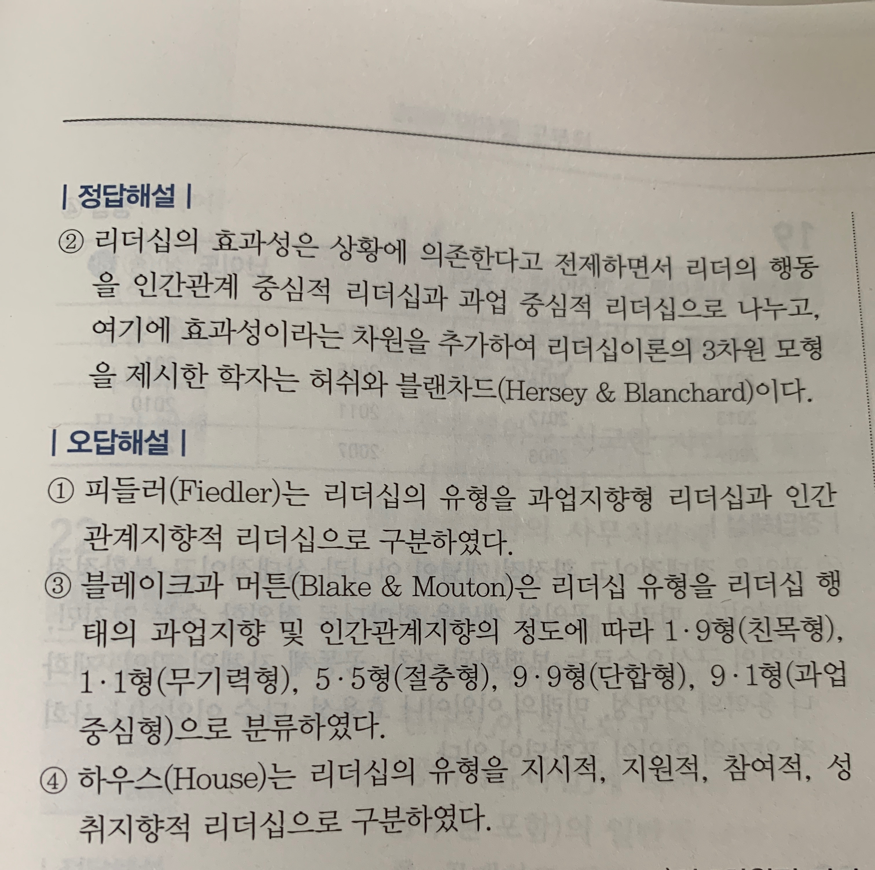 우연히 단체카톡방에서 이 문제에 대해 논란이 생겼습니다. 이 문제 답이 허시와블랜차드가 되는 이유가 단순히 과업'지향'형이냐 과업'중심'형이냐라는 차이때문에 갈리는 건가요? 이것때문이라고 주장하는 분이 피들러도 효율성을 추가했다는건 동일하다고 하더라구요.
