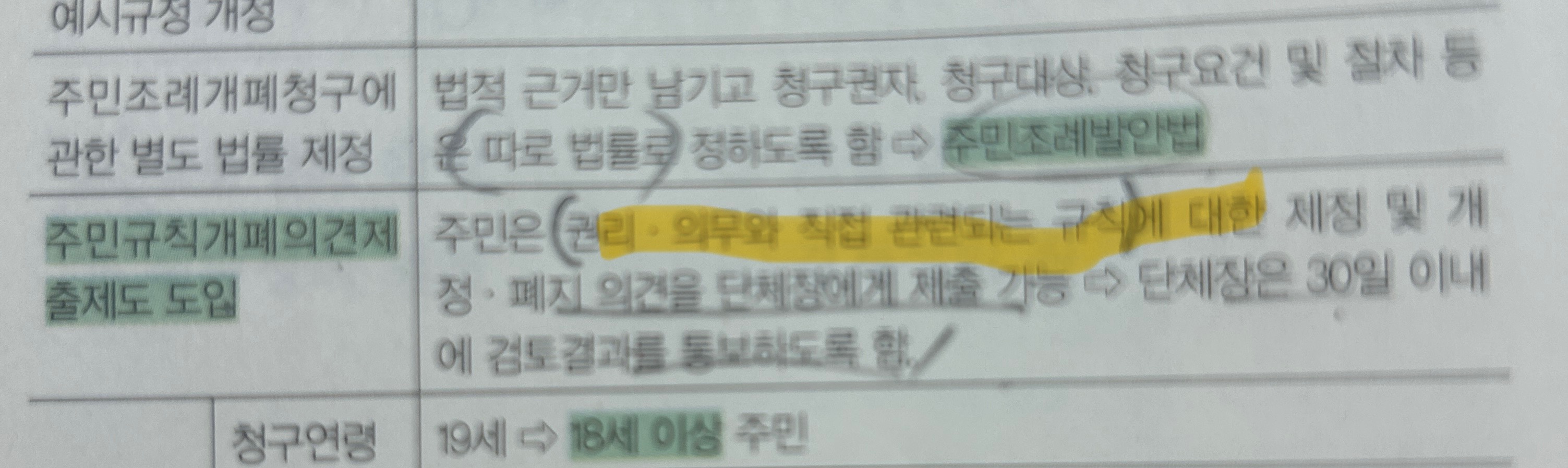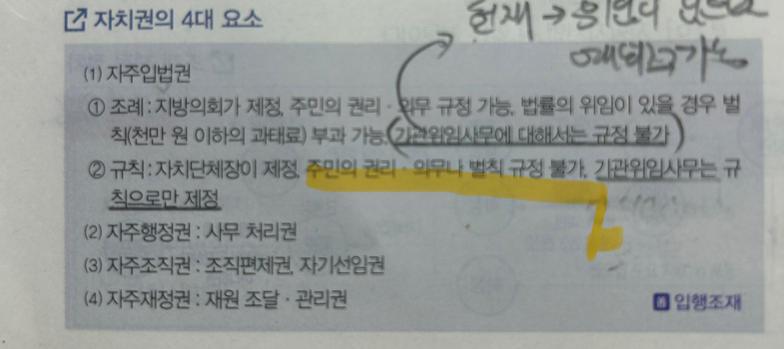 기출 1070쪽 자치권 4대 요소에 자주입법권에서 규칙의 경우 주민의 권리의무나 벌칙규정은 규정 불가라고 되어있습니다 그리고 기출 1082쩍 표의 주민규칙 개폐 의견제출제도 도입 부분에는 주민의 권리의무와 직접 관련 되는 규칙에 대한 제정 및 개정 폐지 의견으루자치단체장에게 제출가능이라고 되어있는데 그렇다면 자치규칙도 주민의 권리의무에 관한 부분을 제정 개정 가능하다는 것인가요