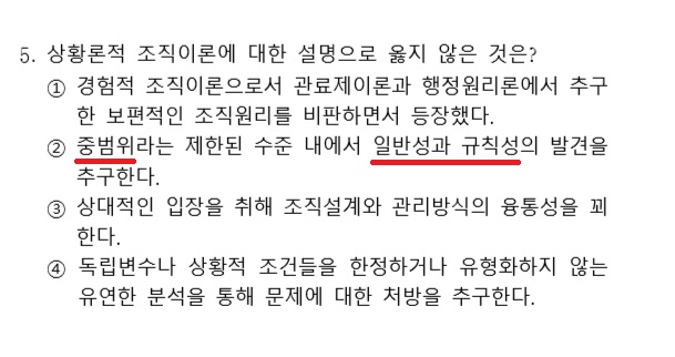 <중범위라는 제한된 수준 내에서 일반성과 규칙성의 발견을 추구한다> 라고 서술되어 있습니다. 상황론적 조직이론의 경우 유일최선의 방법을 부인하고 중범위이론을 추구하여 보편적, 일반적 이론의 정립은 지양하고 상황과 조건에 따른 다양한 변수를 고려해 적응성을 높인다는 특성을 지니는데, 위 2번 선지의 '일반성 규칙성의 발견을 추구'한다는 서술은 오답에 해당하지 않나요? 제가 잘못 이해하고 있는 부분이 있으면 알려주시면 감사하겠습니다.