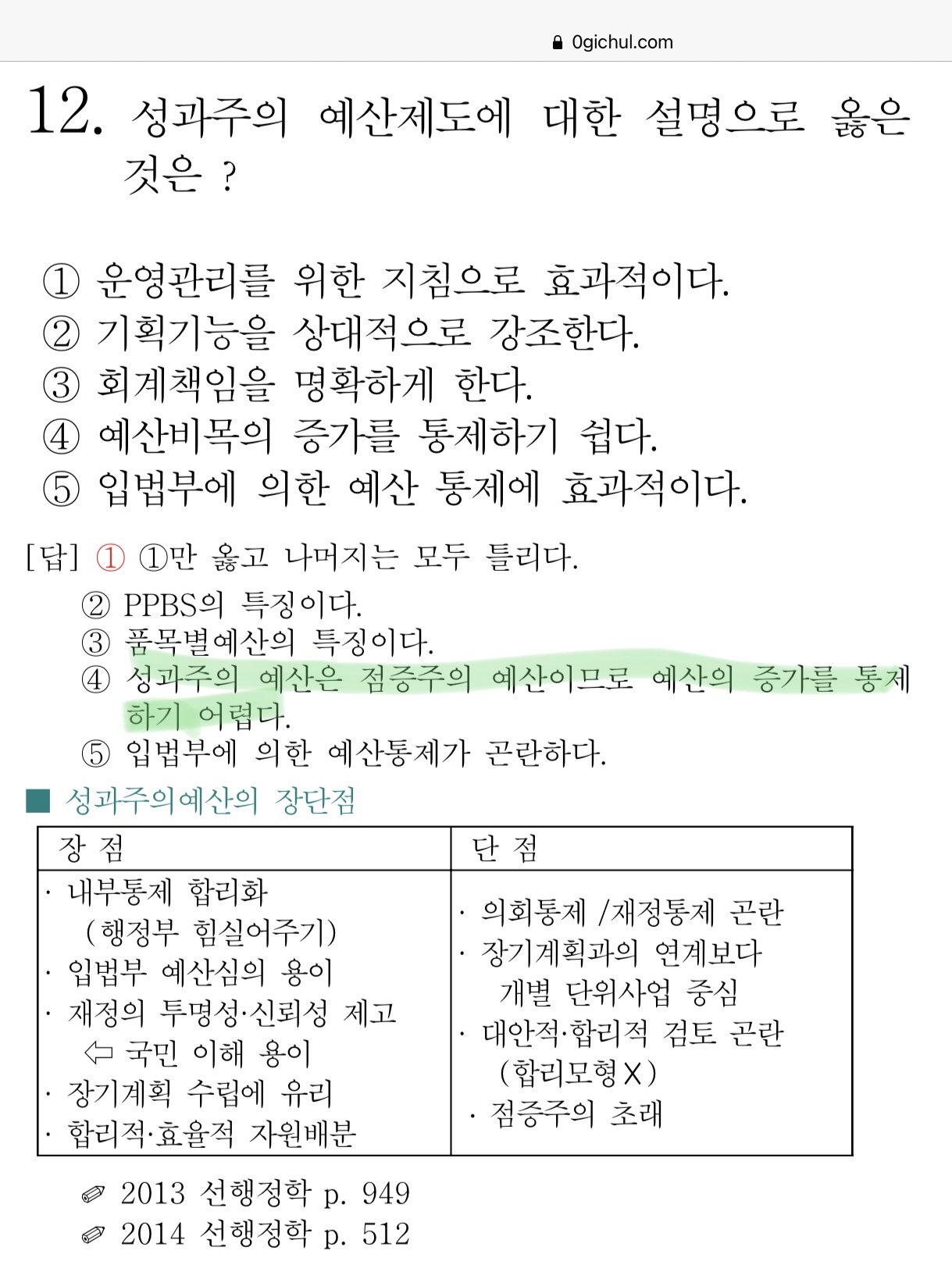 Q. 22년기출 p. 763 1번유제 4번지문에대한시험해설에서성과주의예산은점증주의예산이기때문에예산비목의증가를통제하기어렵다고나와있는데그러면품목별예산제도도해당되는설명맞나요?