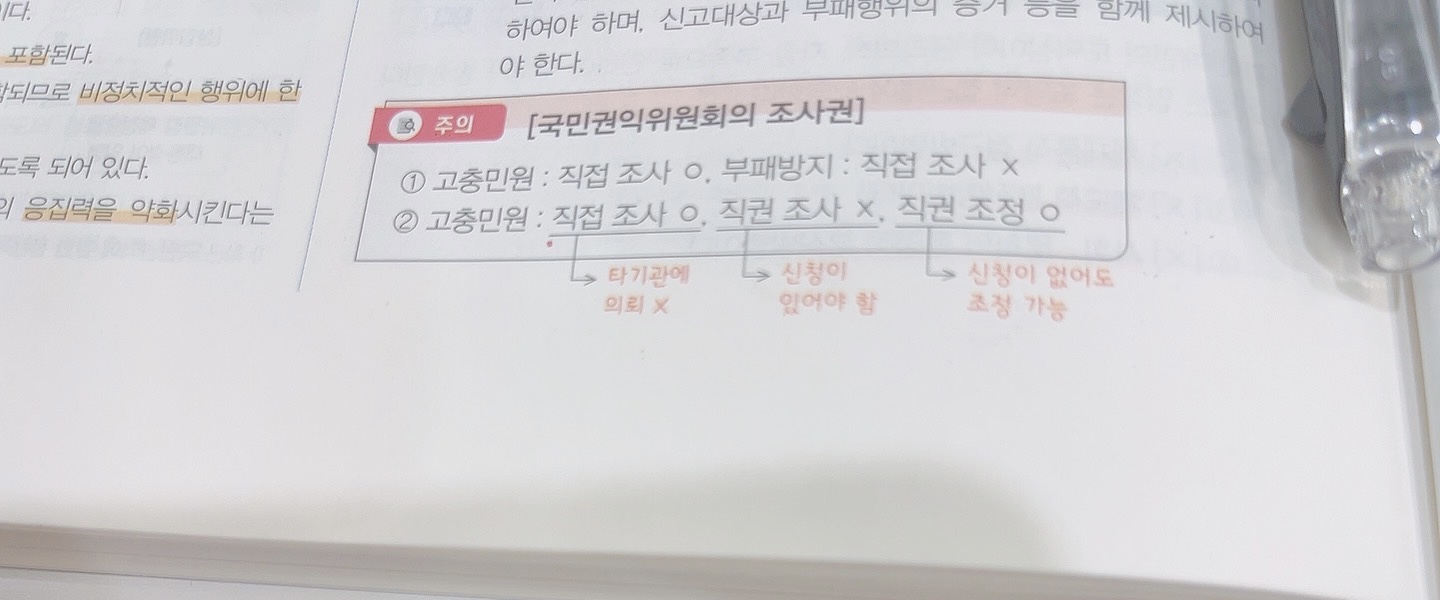 안녕하세요 카스파입니다. 네 맞습니다. 직권조사는 신청 없이 스스로 조사를 개시할 수 있는지 여부이고, 직접 조사는 조사를 진행하는 주체가 권익위인지, 수사기관에 조사를 의뢰해야 하는지에 대한 것입니다. 둘은 엄연히 다른 표현이므로 주의하시기 바라며, 아래와 같이 정리하시면 됩니다. ------------ 직권조사 직접조사 직권조정 고충처리 X O O 부패방지 X X X 감사합니다.