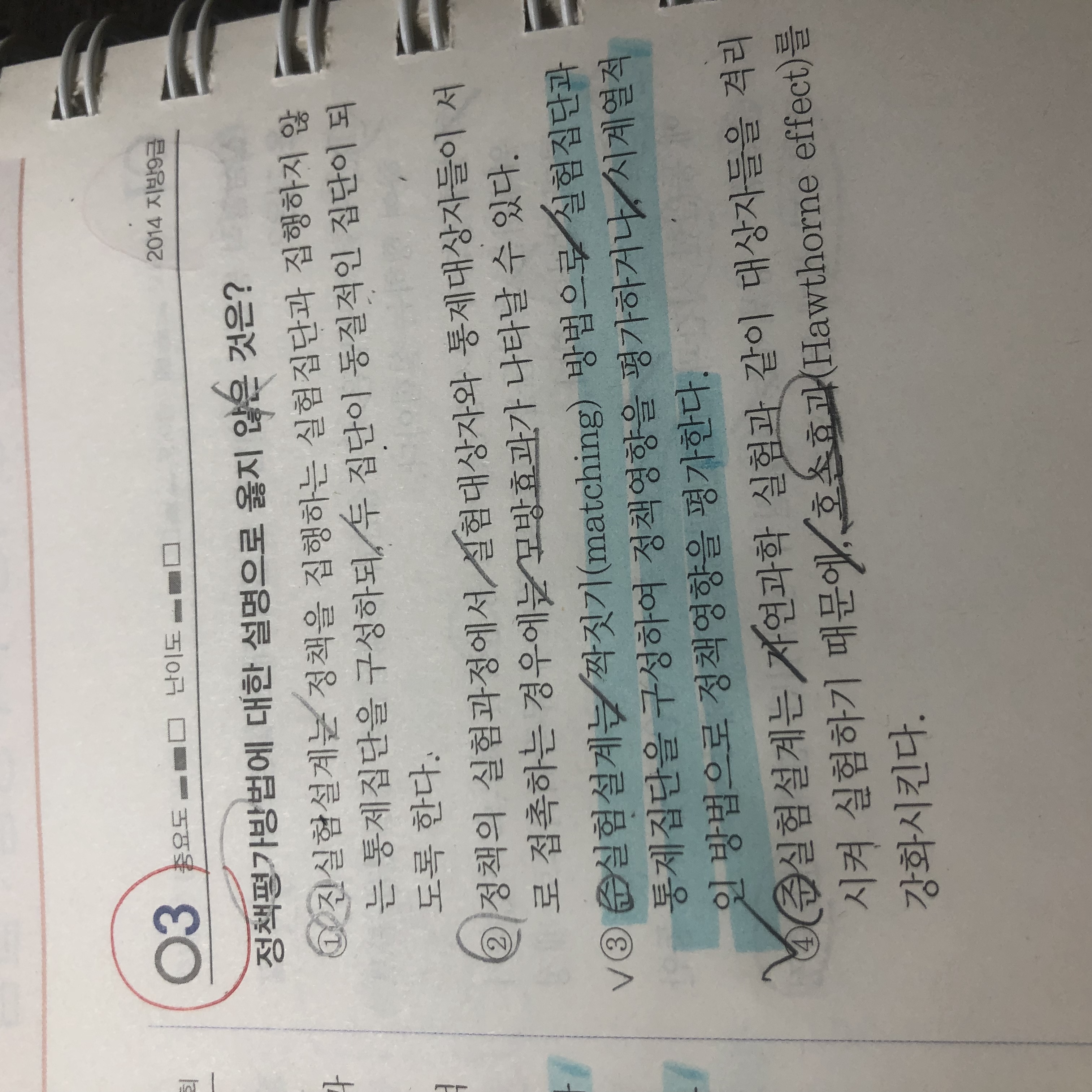 안녕하세요. 선지 3번과 4번에 관하여 질문이 있습니다. 질문1. 짝짓기 방법으로 실험집단과 통제집단을 구성하여 정책영항을 평가한다는 의미를 정확히 모르겠습니다. 실험집단 통제집단은 준/진실험 모두 다 통하는 일반적인 내용인가요? 질문2. 선지 4번에서 호돈효과는 인지를 해서 발생하는 외적 타당도릉 저해하는 요인인데, 호돈효과랑 진실험이랑 무슨 관계가 았나요? 궁금합니다. 감사합니다.