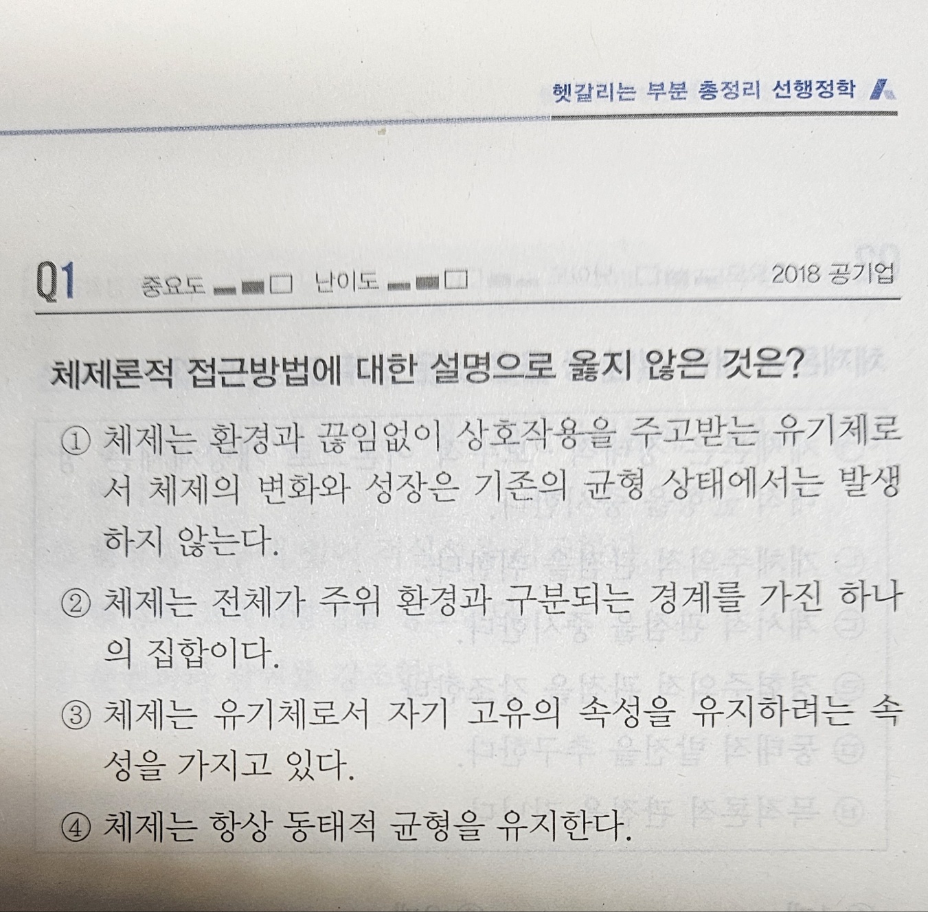 안녕하세요. 체체론에서 체제는 개방체제와 폐쇄체제로 나뉘기 때문에, 체제는 항상 동태적 균형을 유지한다는 틀린 말이다까지는 이해를 했습니다. 그런데 몇 가지 의문점이 있습니다. 1. 그런 관점이라면 위 문제의 1번 선지도 틀린 말이 아닐까요..? 폐쇄체제는 환경과의 투입산출이 이뤄지지 않으니, 1번 역시 개방체체 관점만을 말하고 있는 선지가 아닌가 하여 여쭙습니다. 2. 또한 위 문제의 질문이 "체제론적 접근방법"인데 기본적으로 체제론은 개방체제를 전제하는 이론이 아닌가요? 체제가 아닌 "체제론" 이라고 물어도 폐쇄체제의 존재를 염두해야 하나요? 질문이 많아 죄송합니다. 감사합니다!