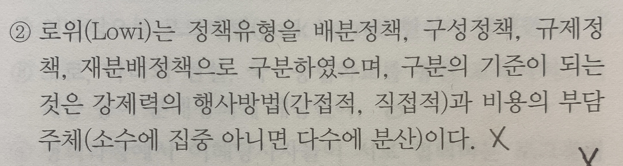 기출 8번문제 2번에서 로위는 정책유형을 강제력의 행사방법과 강제력의 적용대상으로 나누기 때문에 "비용의 부담주체"라는 말이 틀렸는데