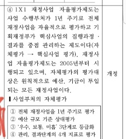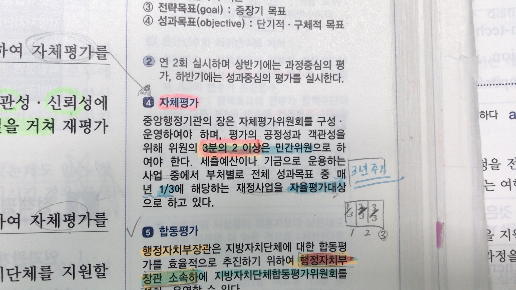 안녕하세요 김중규 선생님 작년 책으로 공부를 하고 있는 학생입니다 정책평가쪽 중앙행정기관 평가의 자체퍙가를 보면 중앙행정기관의 장이 구성 운영 민간위원 2/3이상 자율평가대상 전체 사업중 매년 1/3 재정사업 평가 이렇게 알고 있는데.... 다른 문제를 풀다가 비슷해 보이는 개념을 본것 같은데.. 이거 같은 중앙행정기관 자체평가에 대해서 말하고 있는게 맞나요? 전체 재정사업을 1년 주기로 평가 기재부 장관이 집행과정 중점관리... 비슷한듯 다른듯해서 질문 드립니다
