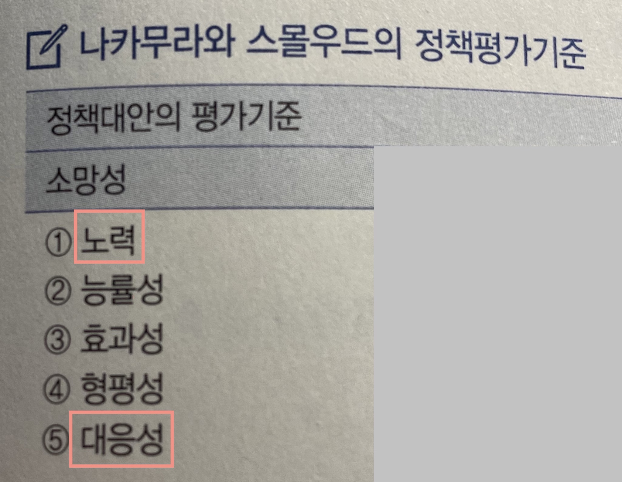2019기출 1권 p.289 2번 해설, 2019필노 p.50입니다 나카무라&스몰우드의 정책대안 평가기준 중 소망성 5가지와 필노에 나와있는 소망성 5가지가 서로 다릅니다 능률성 효과성 형평성은 같은데 나카무라&스몰우드는 노력과 대응성이 있는 반면 필노에는 적합성과 적정성이 있습니다 어떻게 매치시켜야 할까요? 답변 항상 감사드립니다