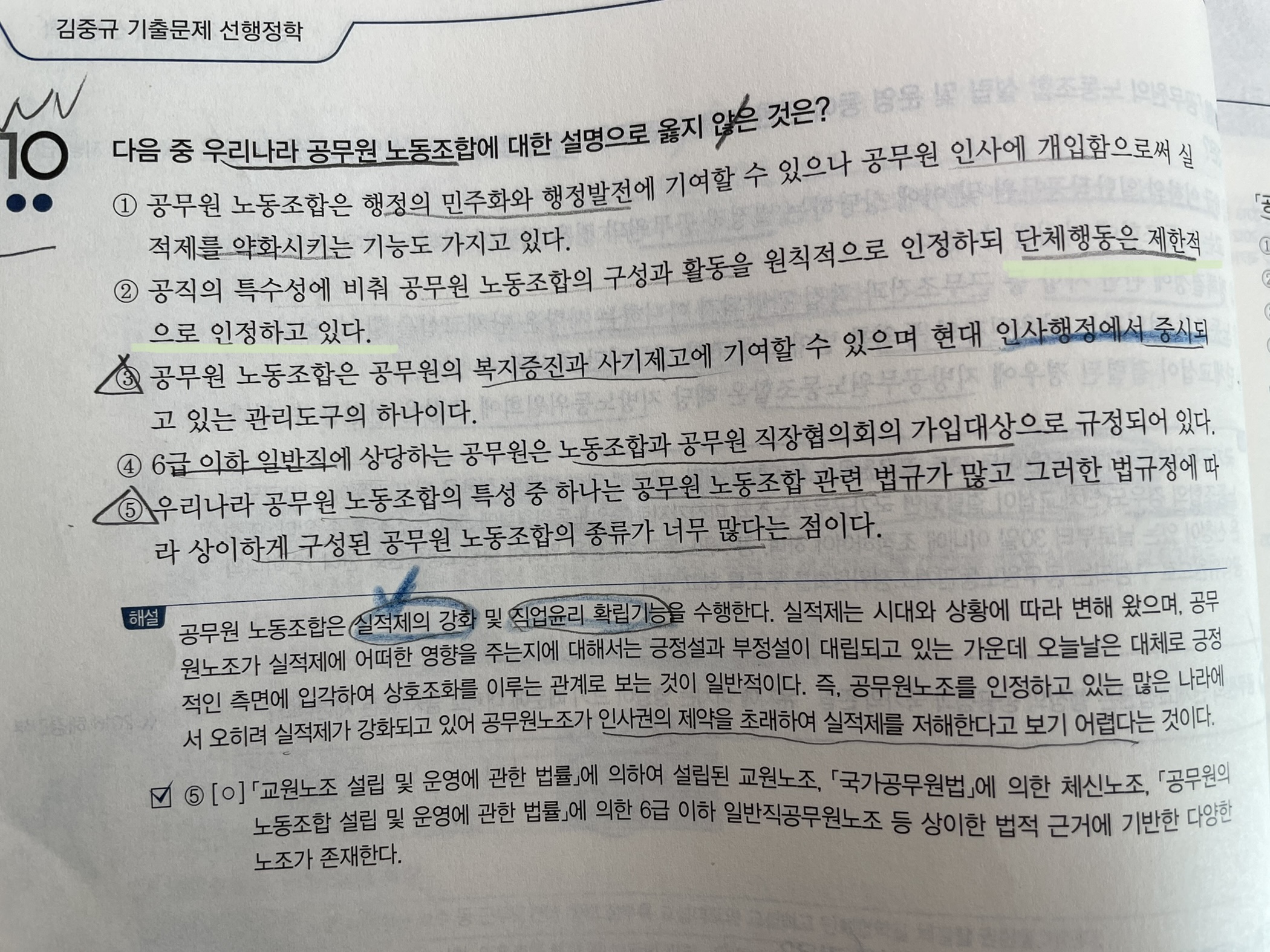 1. 1번 지문은 공무원 노조에 대한 전통적 견해인 부정설의 주장입니다. 그러나 최근 빈출되는 견해는 공무원 노조 긍정설로, 공무원단체를 인정하고 있는 많은 경우에 실적제가 오히려 강화되고 있고, 공무원단체는 부당한 정치적 정실인사를 배제하는 데 기여하여 실적제에 대한 상승효과(시너지효과)가 있다고 주장합니다. 따라서 해당 문제에서는 1번이 틀린 지문으로 처리되었습니다.
