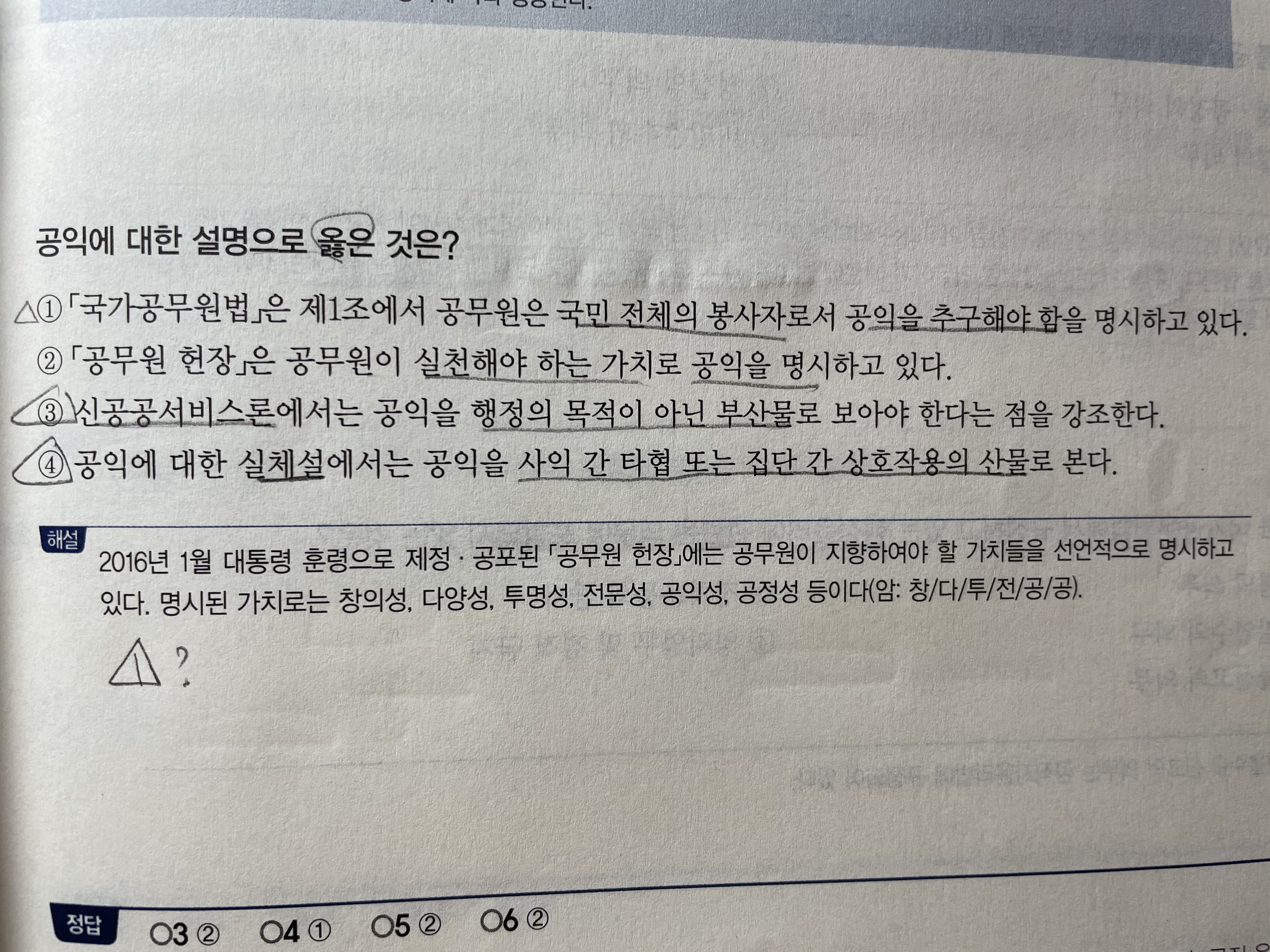 안녕하세요 카스파입니다. 2021 기출집 해설을 아래 첨부해드립니다. ① [×] 「국가공무원법」 제1조(목적)는 국민 전체의 봉사자로서의 자세를 천명하고 있지만 공익 추구라는 가치는 명시되어 있지 않으며, 공정성, 민주성, 능률성 등을 규정하고 있다. ③ [×] 반대이다. 신공공서비스론에서는 공익을 행정의 부산물이 아닌 궁극적인 목표로 보아야 한다는 점을 강조한다. ④ [×] 실체설이 아니라 과정설에 해당한다. 감사합니다.