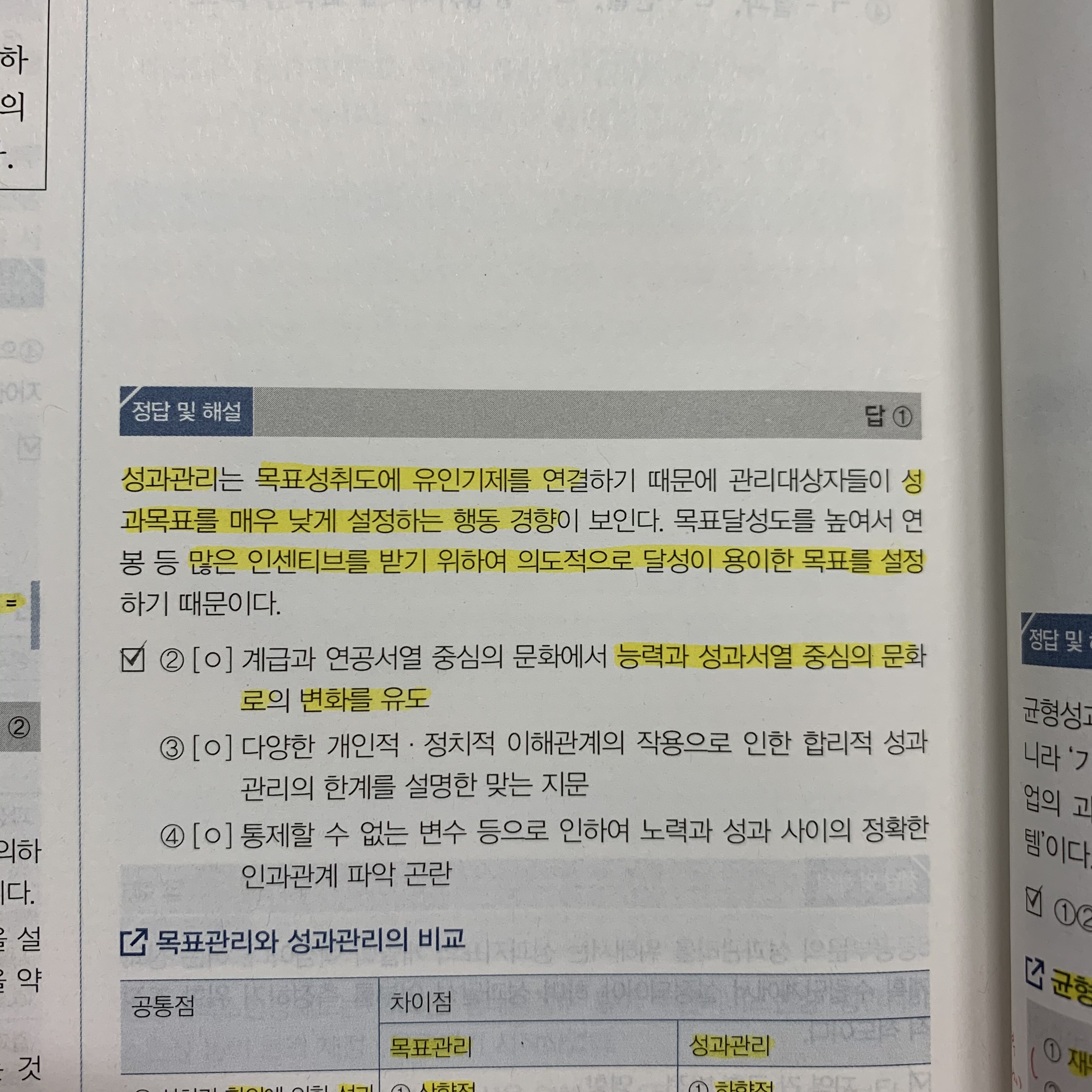 첨부 파일 봐주세요 기출 498쪽 4번 문제 해설에는 성과관리는 성과목표를 낮게 설정하는 경향이 있다고 했는데 추록 109쪽 문제 ㄱ은 왜 성과관리가 아니라 MBO인지 모르겠어요
