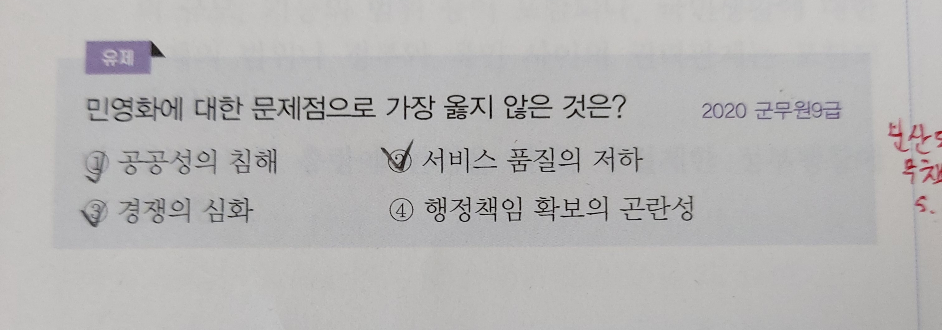 경쟁의 촉진은 민영화의 장점이 되지만 경쟁의 심화는 문제점이 될 수 없고, 공공서비스의 공급을 민간에 맡기면 영리 추구에 치중하여 공공성이 손상되고 서비스의 수준도 저하될 수 있다는 주장(오석홍)이 있습니다. 가답안으로 발표된 정답③은 출제자의 이러한 의도를 반영한 것으로 보이지만 그러나 반대의 논리도 성립이 가능합니다. 공공서비스를 민영화할 경우에 나타날 수 있는 문제점으로는 일반적으로 공공성 및 책임성의 저하 등을 들 수 있습니다. 경쟁의 촉진으로 서비스의 품질은 오히려 향상될 수 있으며 또 경쟁이 지나치게 촉진될 경우 경쟁의 심화라는 문제점도 생길 수 있습니다. 이렇게 볼 경우 정답이 ②가 될 수도 있습니다. 출제자의 의도에 따라 정답이 결정되겠지만 여전히 논란의 여지는 남게 될 문제입니다.