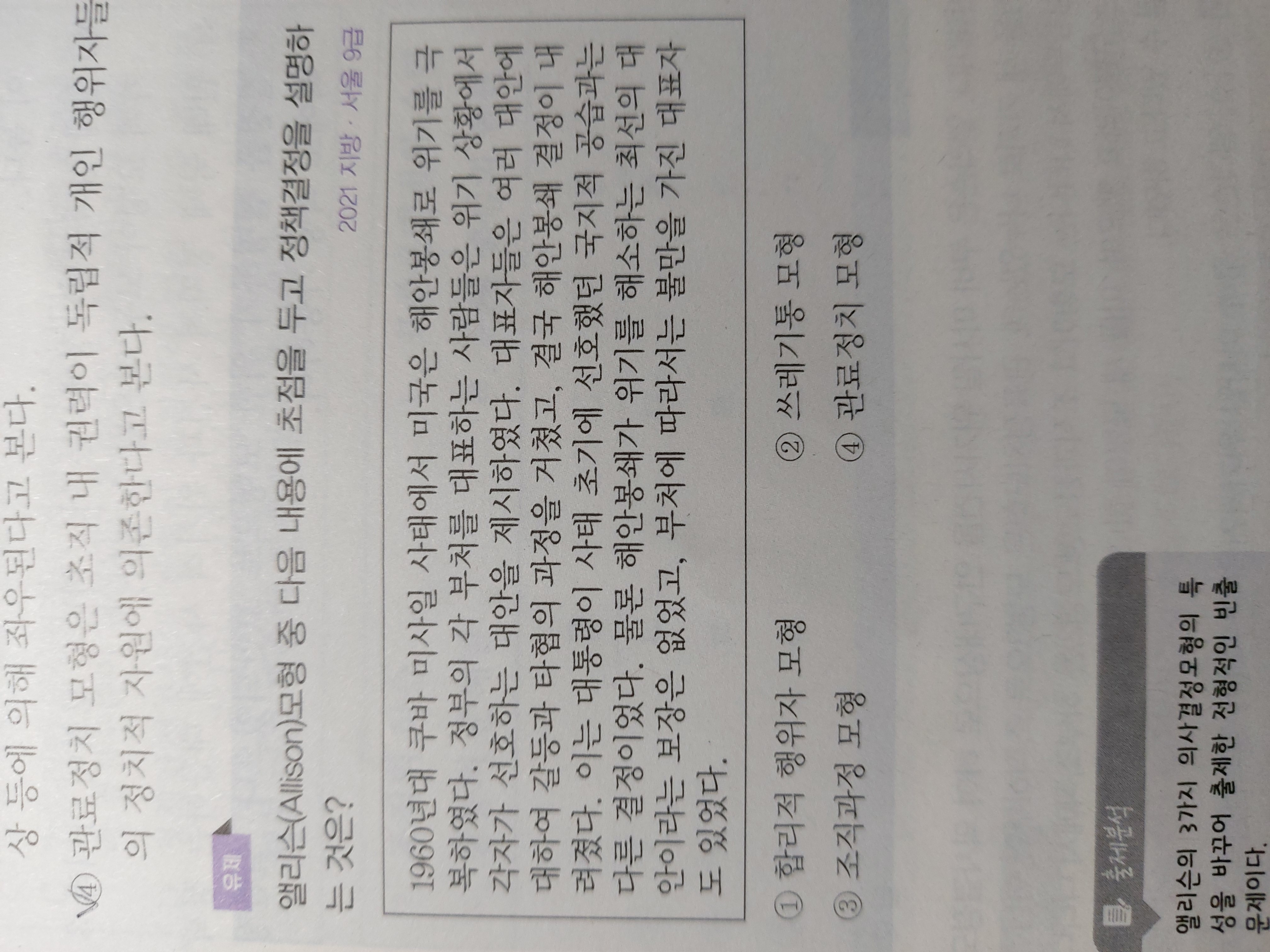 앨리슨(Allison)은 쿠바 미사일 위기에 대한 분석을 통해 합리적 행위자모형, 조직과정모형, 관료정치모형이라는 3가지정책결정모형을 제시하였기에 일단 쓰레기통모형은 해당 선지에서 제외한뒤 가장 해당 내용과 유사한 관료정치모형을 선택해야하는 문제입니다. 물론 관료정치모형이 쓰레기통모형과 유사한 성격을 지니지만 해당 설명에서는 앨리슨이 3가지 모형을 제시하게된 배경과 그 세부내용을 설명하고 있기에 해당내용을 제외하고 참여자들 간 갈등과 타협, 협상 등에 의해 정치적으로 좌우된다고 본다는 부분이 핵심 내용으로가장 해당 설명에 가까운 선지를 선택해야하는 문제입니다.