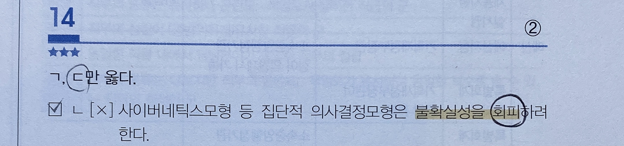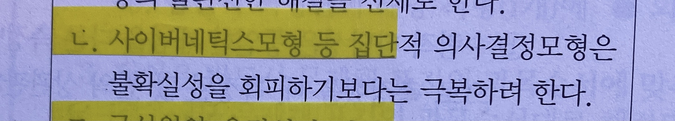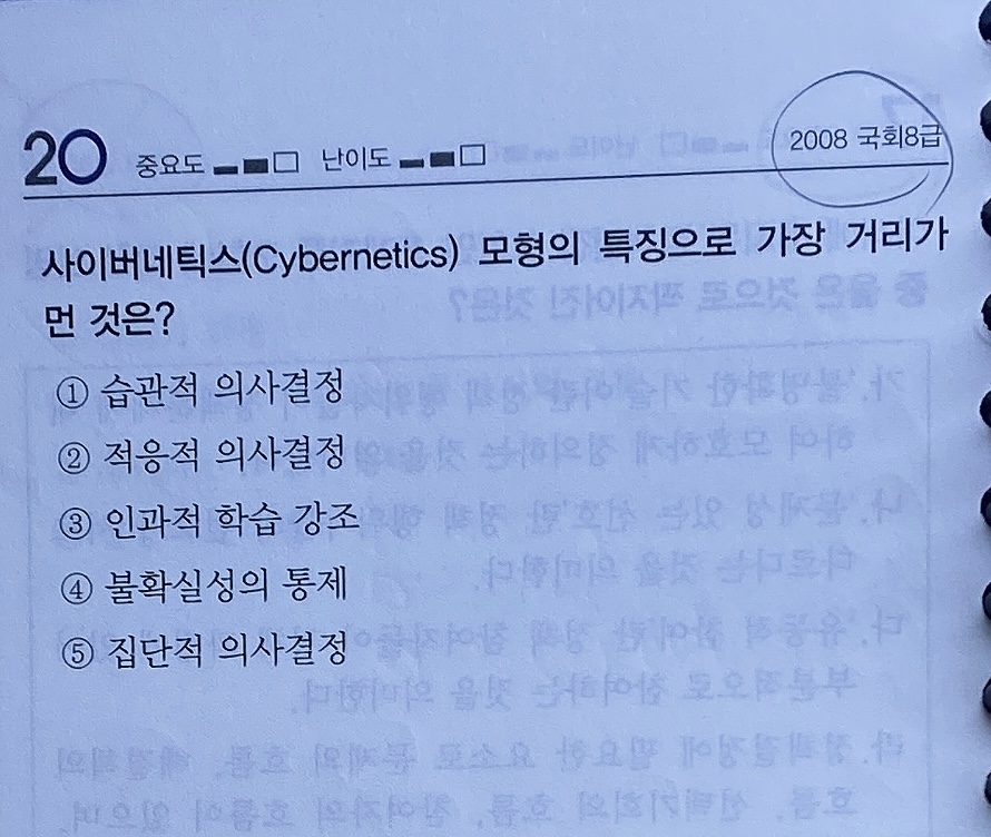 안녕하세요. 기출과 모의고사를 풀다가 모순되는 부분이 있어 질문합니다. 2021 7급 기출 306쪽 10번 문제엔 특징에 불확실성 '통제'라고 되어있는데, 2021 7급 모고 169쪽 14번 문제 ㄴ 해설에는 불확실성을 '회피'한다고 되어 있습니다. 사이버네틱스 모형'만의' 특징은 불확실성 통제이지만, 사이버네틱스 모형 '등과 같은 집단적 의사결정 모형'은 불확실성을 회피하려는 것인가요?