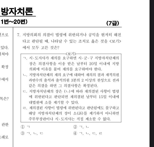 16회 13번 이고요. 18년 서울시 지방자치론 문제 긁어 오신 것 같은데 찾아보니 공식 답이 1번(ㄱ만 옳음)으로 나와있습니다. ㄴ에 ''지방자치단체'가 아니라 '지방자치단체의 장'이 재의 요구한 것 아닌가요~? 보기가 하나하나 다 정확해야 답이 나오는 문제라서 상대적으로 풀 수도 없었네요. 확인 부탁드리겠습니다.