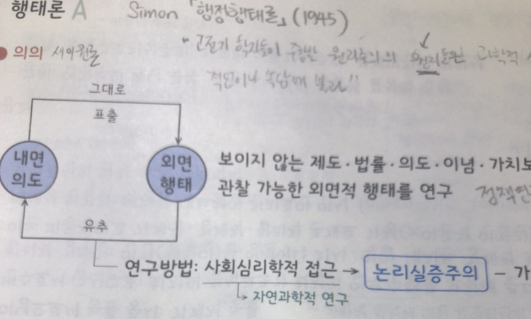 사이먼(Simon)은 논리실증주의에 입각하여 그의 행정학을 구성함에 있어서 사회심리학적 접근법에 의거하고 있습니다. 즉, 그는 행정을 의사결정 과정(decision-making process)을 핵심으로 하는 행정행태로 파악하고 그것을 구명하려 하고 있는데, 행정은 넓은 의미로는 ‘협동적 집단행동'이고, 좁은 의미로는 '조직내의 인간적 협동에 공통되는 여러 형태의 유형'으로 보고 있는 것입니다. 따라서 행정에 작용하고 있는 심리적 과정의 분석이 행정연구의 중심과제라는 것이며, 행정인(行政人)의 심리적 특성이나 이념·가치관·개성 등으로 인하여 행정조직은 특정한 방향으로 행동하게 되고, 또 의사결정도 이들 요인에 의하여 좌우된다는 것입니다.