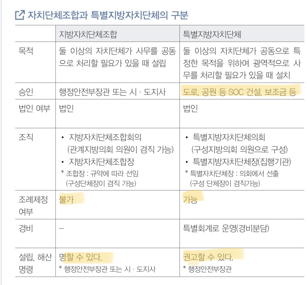 1. 승인 줄에 도로,공원 등 soc 건설~ 은 무슨 말인가요? 2.특별지방자치단체의 예로 자치단체조합이 유일해서 특별지방자치단체=자치단체조합이라고 봐도 된다고 하셨던 답변을 봤는데 색칠한 부분은 왜 차이나는 건가요? 자치단체조합이 특별지방자치단체에 속하는데 왜 차이가 나는지 이해가 안 가요 ㅜ