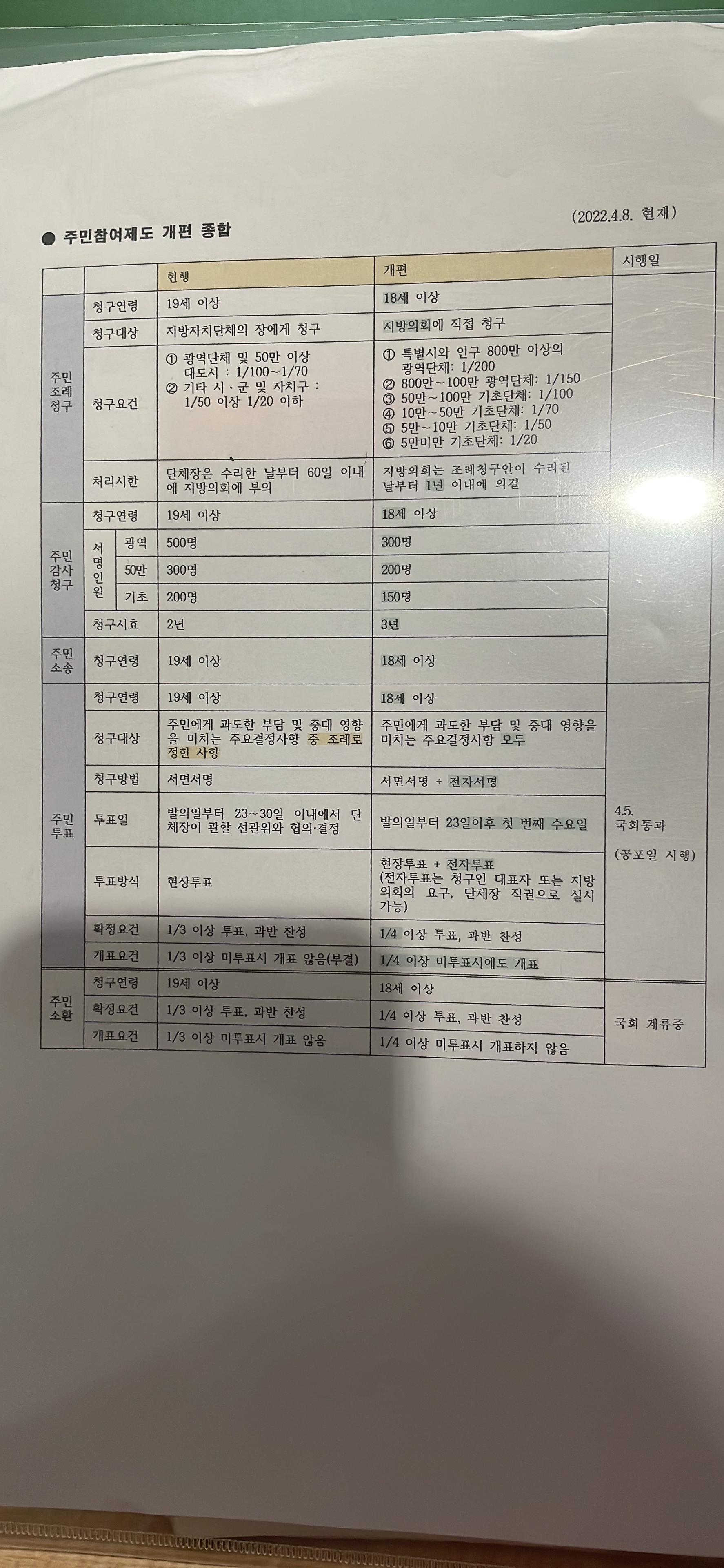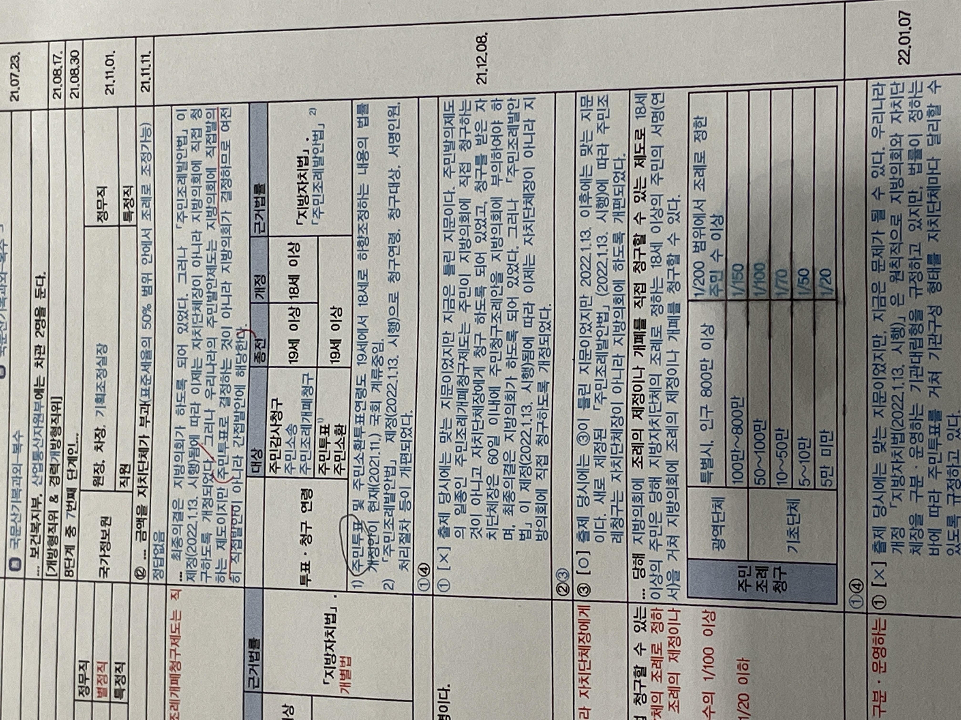 안녕하세요 1. 주민참여제도 개편 종합 자료에는 주민투표 "청구연령이 18세 이상"이라고 적혀있습니다 이때 투표연령이 아니라 청구연령 맞나요? 2. 정오표에는 주민투표가 "투표연령 19세" 이상이라고 나와있습니다 주민참여제도 개편 자료에서 주민투표 18세 이상으로 개정된 것이 "투표연령"에 해당한다면 정오표와 개편 자료가 서로 일치하지 않습니다 다시 정오표를 추가하셔야하는 게 아닌지요 3. 그리고 투표연령과 청구연령을 같다고 보면 되나요? 4. 아래에 제가 정리한 것이 맞나요?