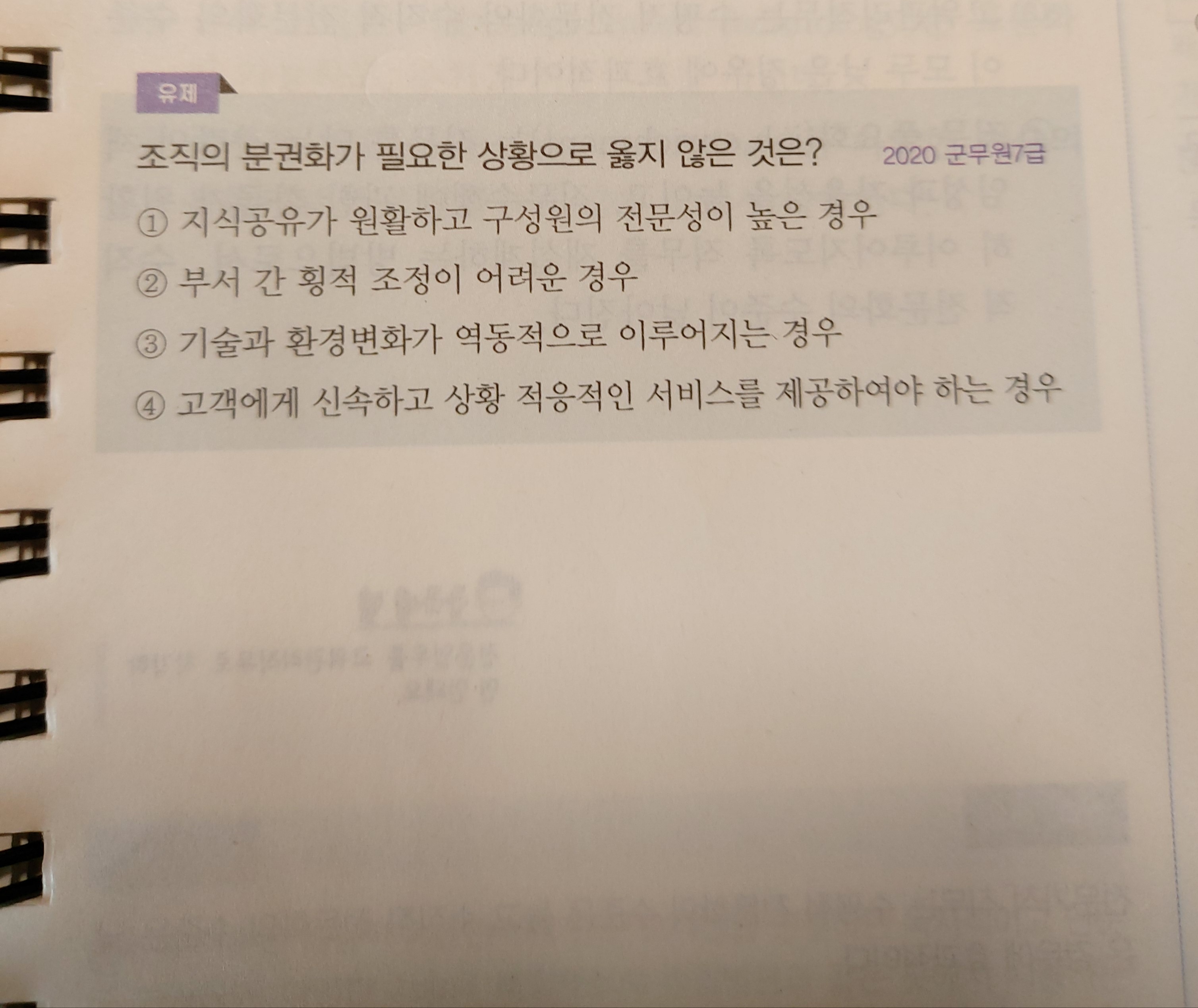 안녕하세요 카스파입니다. 이 문제는 저도 애를 먹었던 문제여서 기억이 납니다. 조금 암기가 필요한 부분입니다. 부서간 횡적 조정이 어려운 경우엔 수평적 조정을 촉진시키려면 집권화가 필요합니다. 지식공유가 원활하고 전문성이 높은 경우엔 구성원에게 좀 더 권한을 주는 분권화가 더 필요합니다. (알아서 처리하도록) 감사합니다.