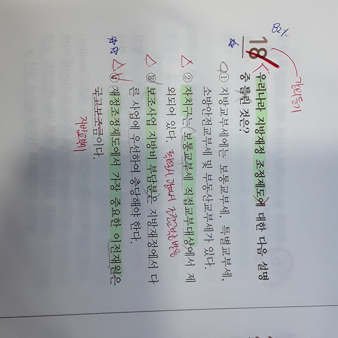 지방재정 조정제도 문제 대비방법 질문드립니다 3회 문제들입니다. 저는 해당 회차애 75점을 받았는데요. 이 두 문제가 정답률이 굉장히 높은데 저에게는 생소해서 어떤부분을 놓친걸까하고 1. 여다나 2. 기출문제집을 뒤져봤는데 해당파트는 지방자치 전체적으로 녹여있는? 혹은 상식적인 ? 수준의 문제같더라구요.. 왜냐하면 해당되는 파트가 따로 있진않았어요. 제가 해당부분을 찾아봤을때 18번의 2번의 경우 자치구는 보통교부세 직접교부대상에서 제외되어 있다 (ㅇ)였는데, 여다나 374쪽 보통교부세의 개념상에는 '수요액 대비 수입액이 1이하시 자치단체에 교부한다' 고 써있는데 다른분들은 어떻게 자치구에 보통교부세 직접교부새 대상에서 제외되어있는걸 안거지?;;;;;라는 생각이들었어요 ㅠㅠㅠ 선지 3번, 4번은 찾지도못했구.... 이런 문제를 대비하기 위해서는 무엇을 봐야될까요?ㅜㅜ 혹시 대비할수있는 파이널강좌 소개해주실수있나요? 기출문제집이랑 여다나를 봐서는 저로서는 쉽게 이해가 안되는 논점이라서 지금 굉장히 당황스러워요.ㅠㅠ 도와주새요 ㅠㅠㅠ ![]()