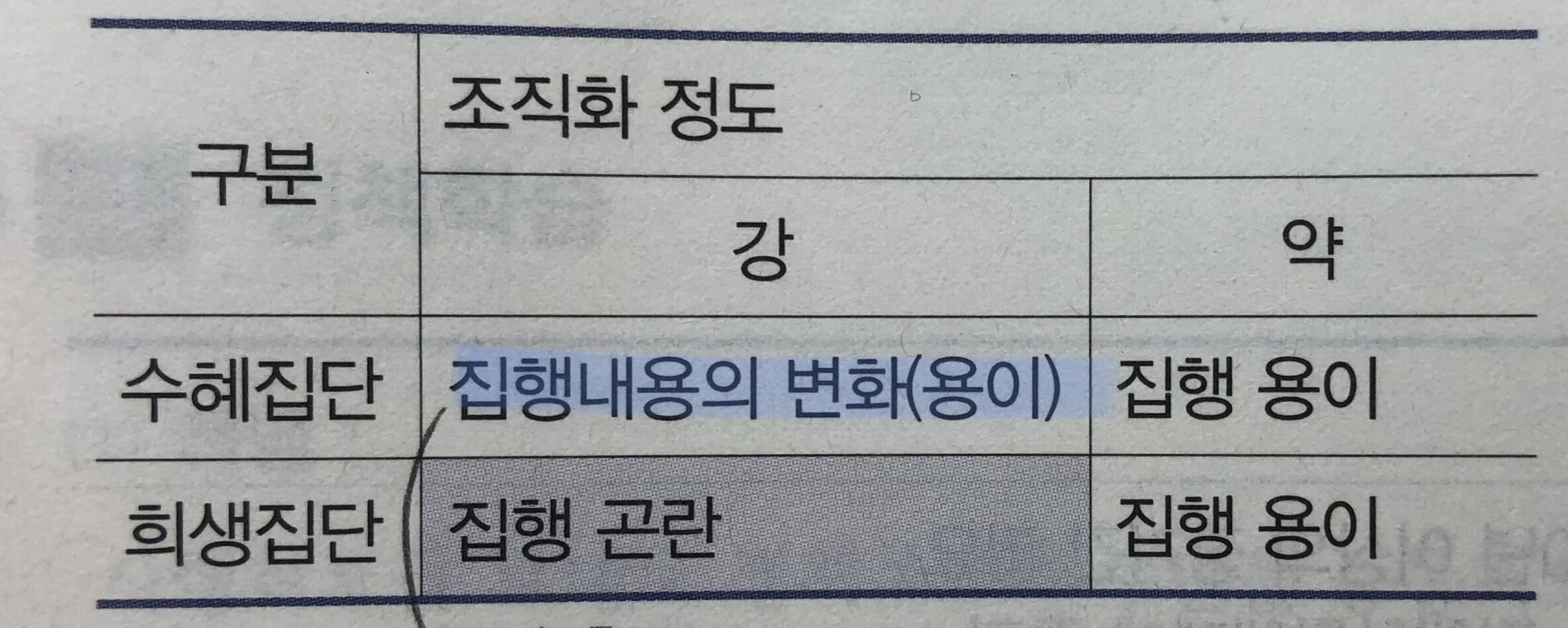 표 2 대상조직의 규모와 조직력에 따른 정책집행 용이 여부 집행내용의 변화(용이)가 '대상집단에게 요구되는 행태의 변화가 용이하다'는 뜻이라는 답변을 받았는데 잘 이해가 안 가서요.. 조직화 정도가 강한데 어떻게 대상집단에게 요구되는 행태의 변화가 용이한가요?