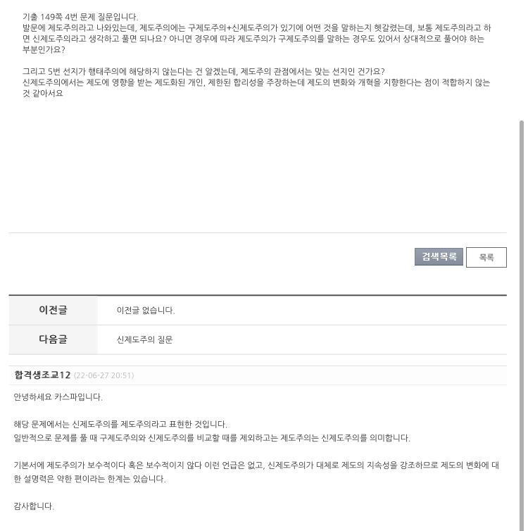 ㅡㅡㅡㅡㅡㅡㅡㅡㅡㅡㅡㅡㅡ 위 답변에서는 제도병화에 대한 설명력은 약한 편이고 하셨는데 18번문제 해설 2번째 줄에 '제도의 안정성보다는 제도설계와 변화 차원에 관심을 보이고 있다' 라고 나와있거든요 설명부탁드립니다 감사합니다