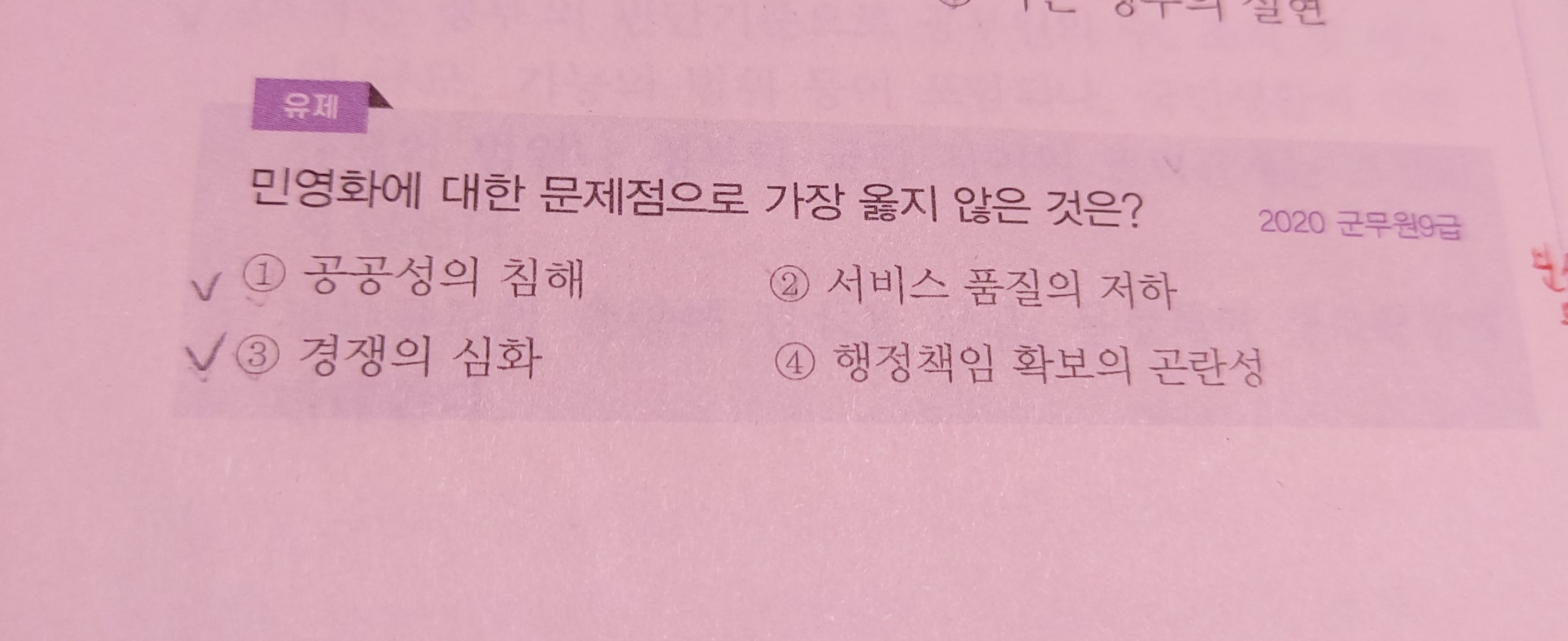 경쟁의 촉진은 민영화의 장점이 되지만 경쟁의 심화는 문제점이 될 수 없고, 공공서비스의 공급을 민간에 맡기면 영리 추구에 치중하여 공공성이 손상되고 서비스의 수준도 저하될 수 있다는 주장(오석홍)이 있습니다. 해당 문제에서 가답안으로 발표된 정답③은 출제자의 이러한 의도를 반영한 것으로 보이지만 그러나 반대의 논리도 성립이 가능합니다.