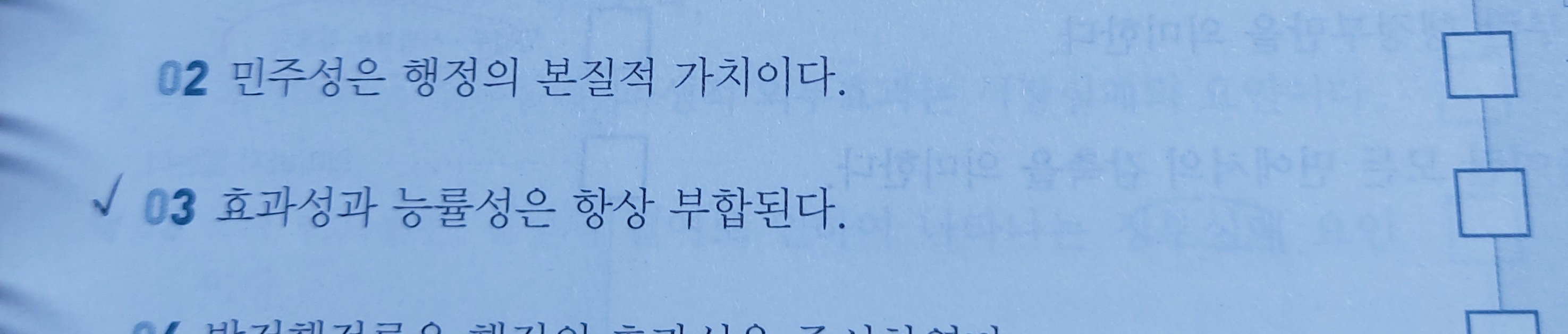 22 9급여다나 54p 2번표를보면 능률성쪽에 효과성이있고 , 둘다 이원론계열의 가치라고 나오잖아요? 근데 사진속 3번지문(21 ox파이널 26p)에서는 효과성과 능률성이 같은쪽에 있어도 항상 부합하지 않는다는걸 의미하나요?