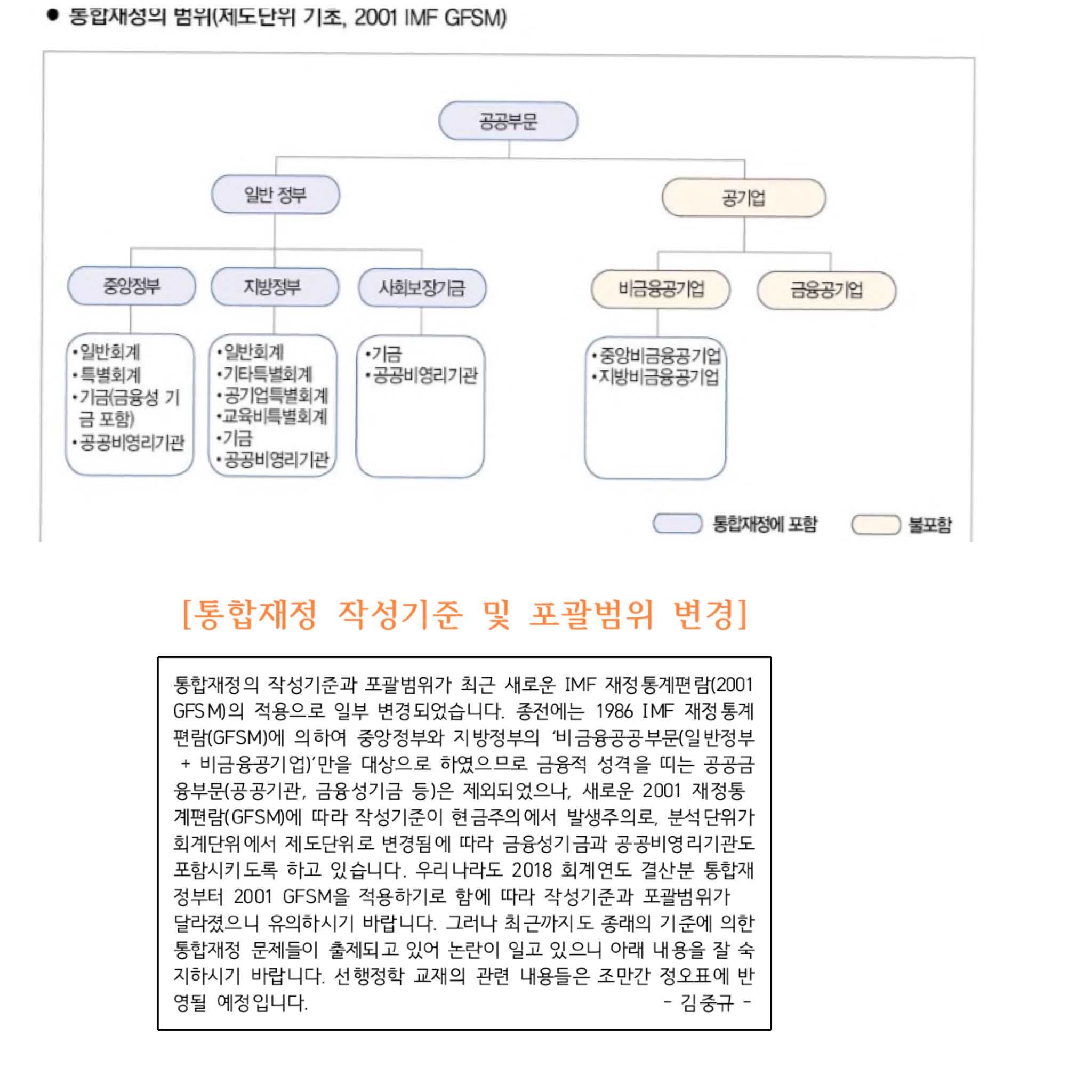 위에는 비금융공기업이 안들어간다고 하고 아래(공지사항 통합재정 글에 첨부된 파일) 기존에는 일반정부+비금융공기업 을 대상으로 했지만 이제는 금융성기금과 공공비영리기관도 포함시킨다고 나와있습니다. 이는 기존 비금융공기업도 그대로 통합재정에 포함된다는 의미 아닌가요?