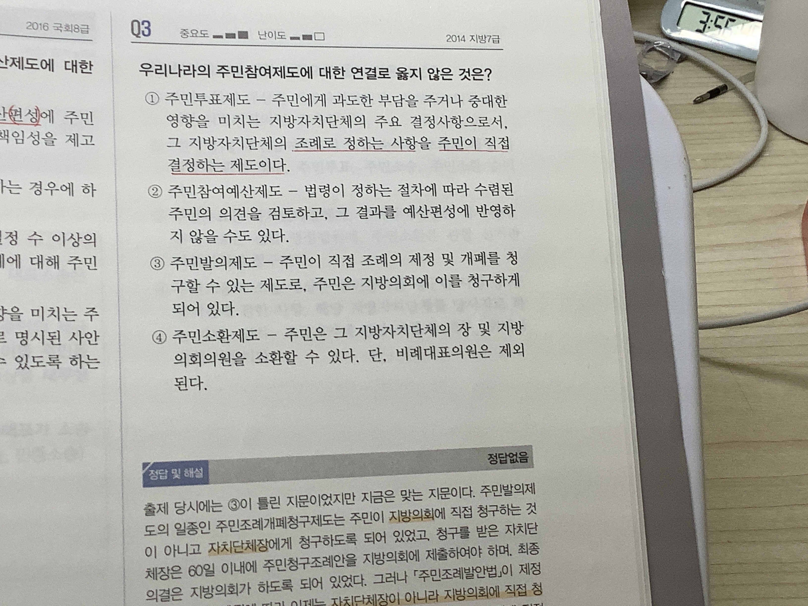 안녕하세요 10.29일 자로 지방직 7급을 보는 학생입니다 "주민투표제도 개정사항에서 주민에게 과도한 부담을 주거나 중대한 영향을 미치는 지방자치단체의 주요결정사항(조례로 정하는 사항에서 개정됨) 은 주민투표에 부칠 수 있다. "라고 10.27일 자로 개정된 것으로 알고 있는데, 그럼 1번을 틀린 지문으로 봐야할까요?