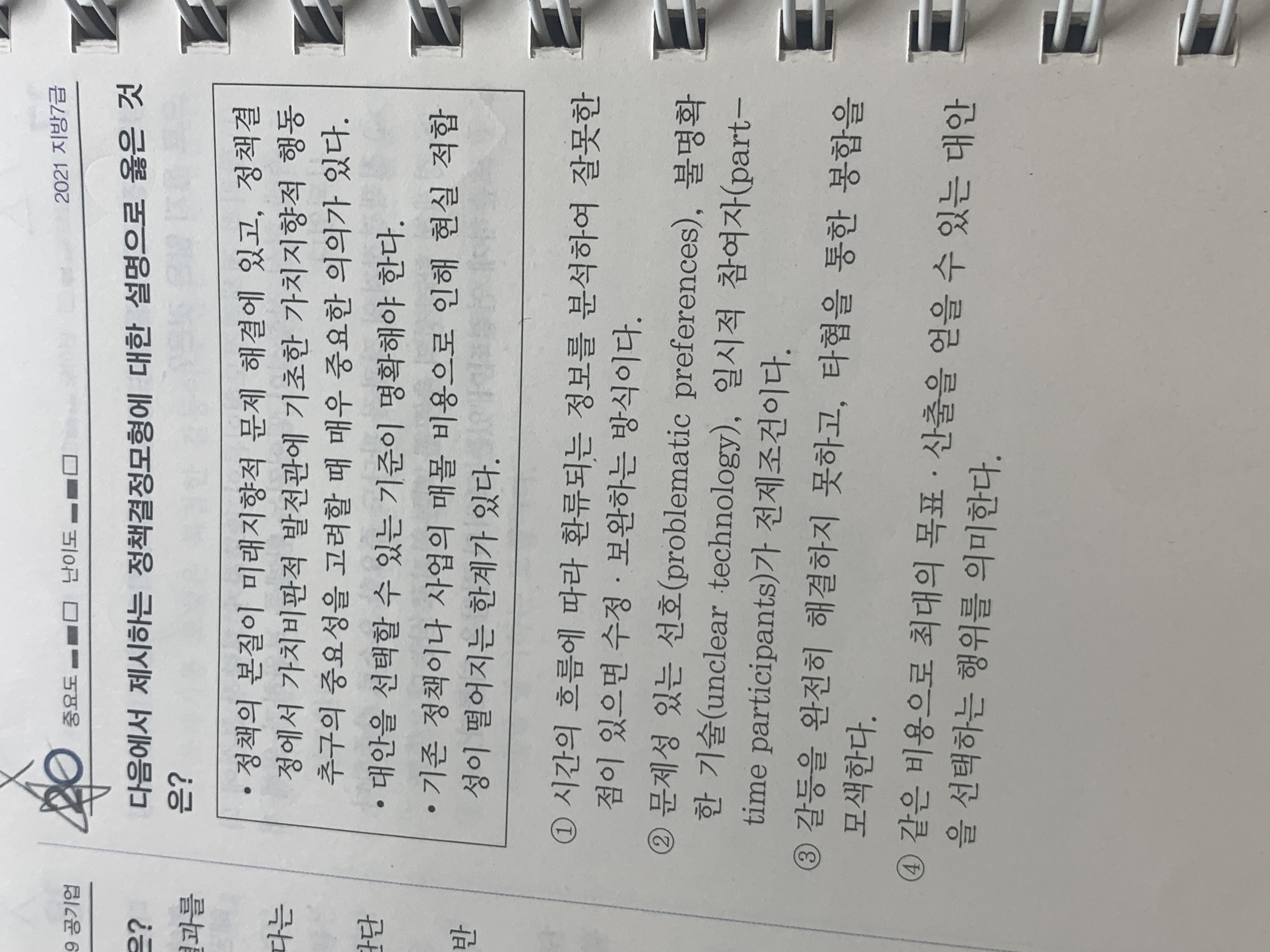 이문제 에서 기존 정책이나 사업의 매몰 비용으로 인해 현실 적합성이 떨어지는 한계가 있다는 데 이것은 왜 합리모형에 대한 설명인가요? P.296쪽 8번 지문과 대조해서 다. 매몰비용의 존재는 전혀 새로운 정책대안을 받아들이지 못하는 주요 원인이 될 수 있다. 이지문은 점증주의에 대한 지문인데 두 문장이 헷갈립니다