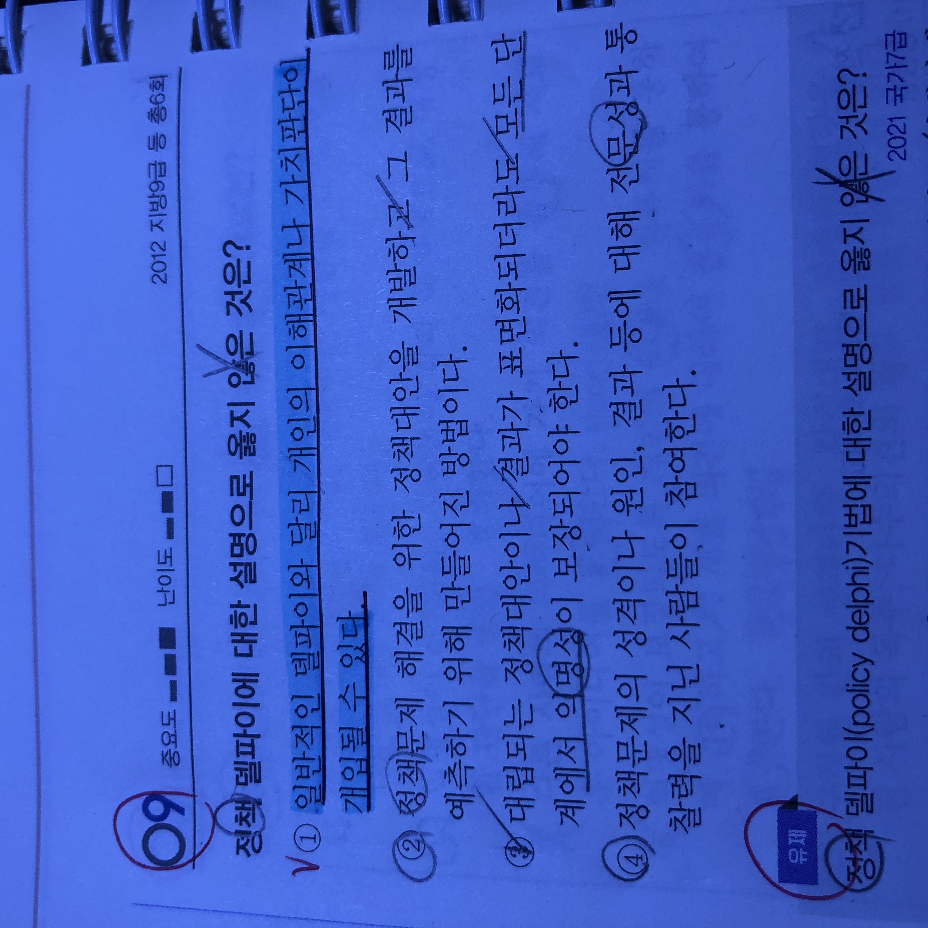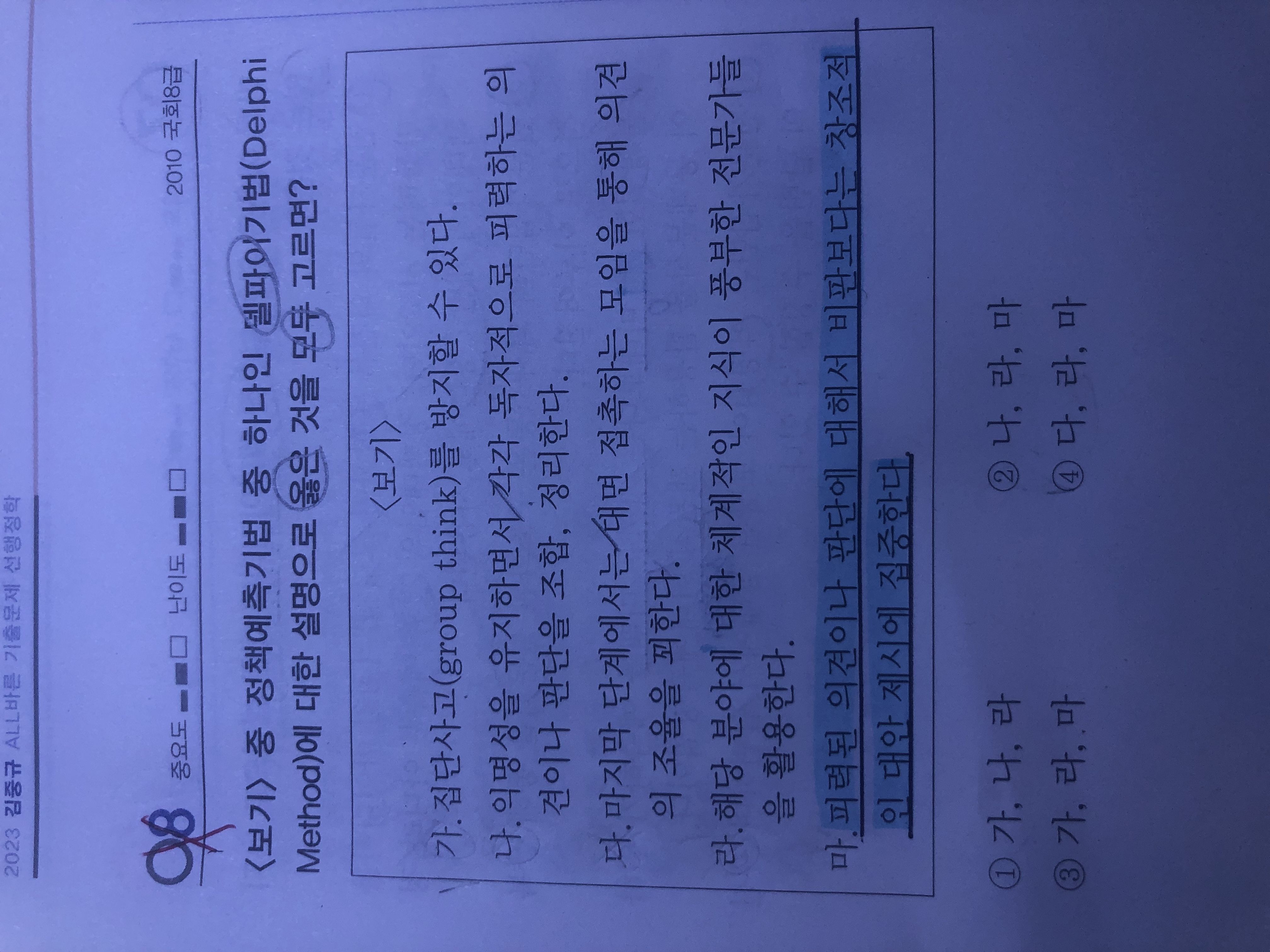 안녕하세요. 질문1.(8번 문제) 선택지 마) 델파이 또한 비판보다는 의견의 대표값을 중시하는 것 아닌가요? 또한 델파이는 대안 제시는 하지 않는가요? 그냥 설문조사인가요? 질문2. (9번 문제) 선택지 1번 '델파이'도 정책 델파이처럼 전문가가 참여하니 개인의 가치판단이 개입될 수 있는 것 아닌가요? 감사합니다.