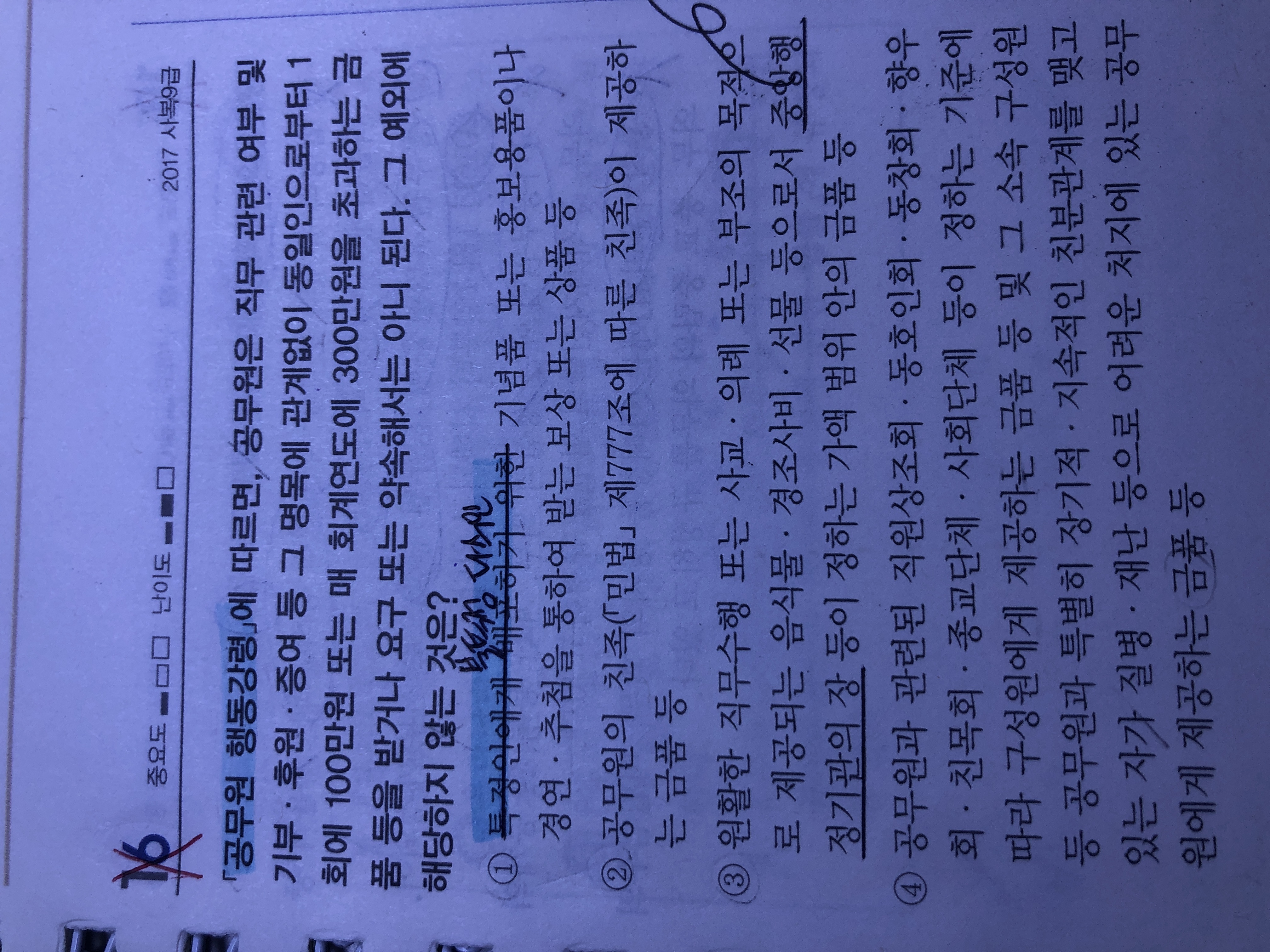 안녕하세요. 문제에서 '공무원 행동강령'에 따르면이라고 되어있는데요? 아래 내용들은 김영란법에 해당되는 것 아닌가요? 감사합니다.
