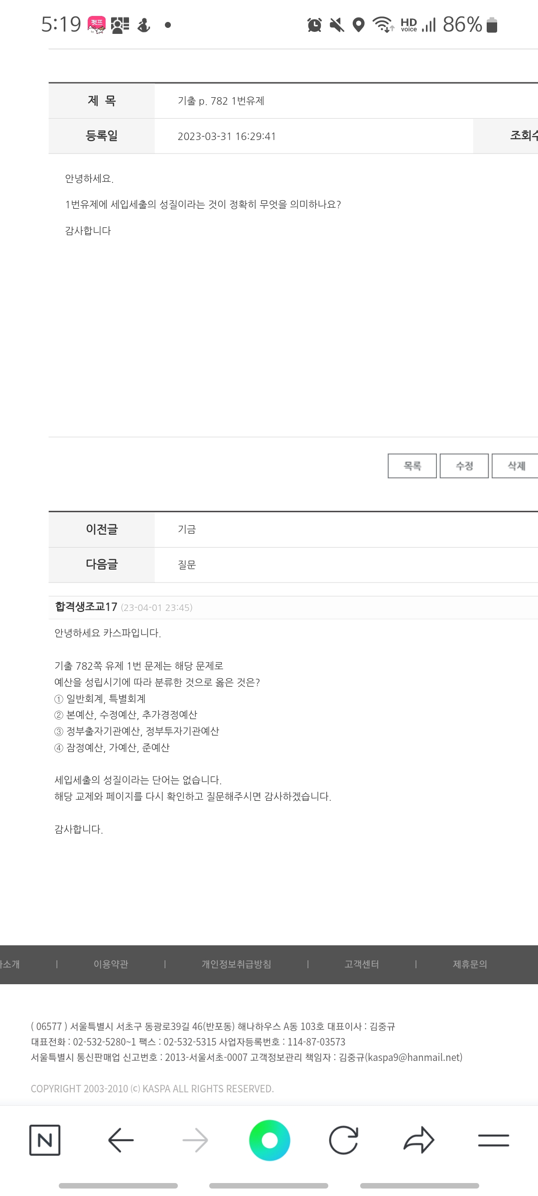 현재 답변하는 조교들은 모두 현직에 종사하거나 발령을 기다리는 분들입니다. 인터넷 파일로 가진 교재를 통해 답변을 달고 있는데, 실제 출간된 교재와 달라 몇몇 문제는 답변이 어려울 수도 있습니다.