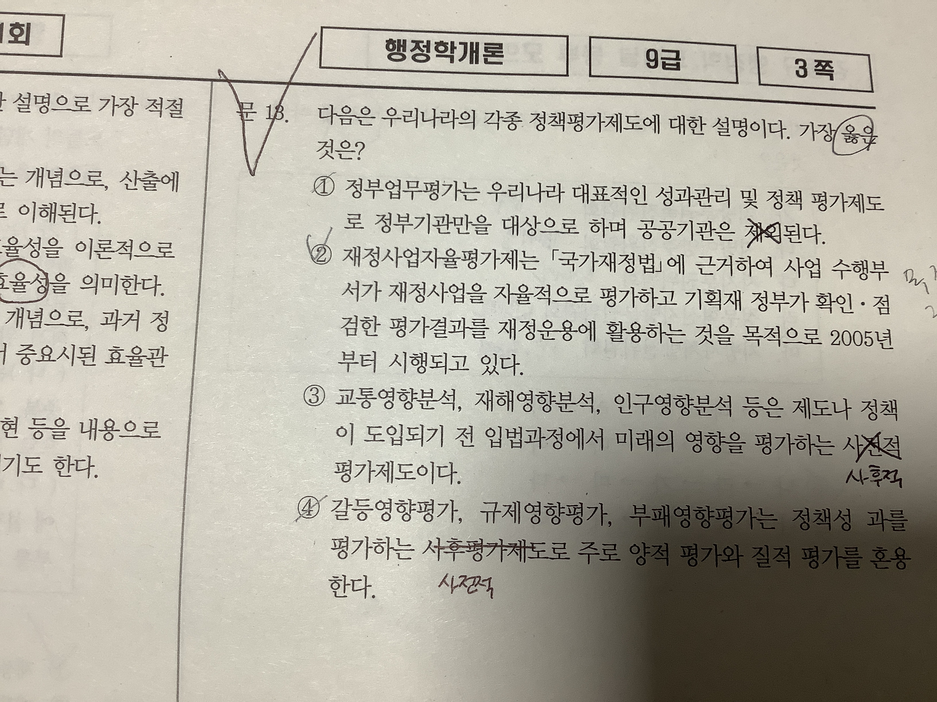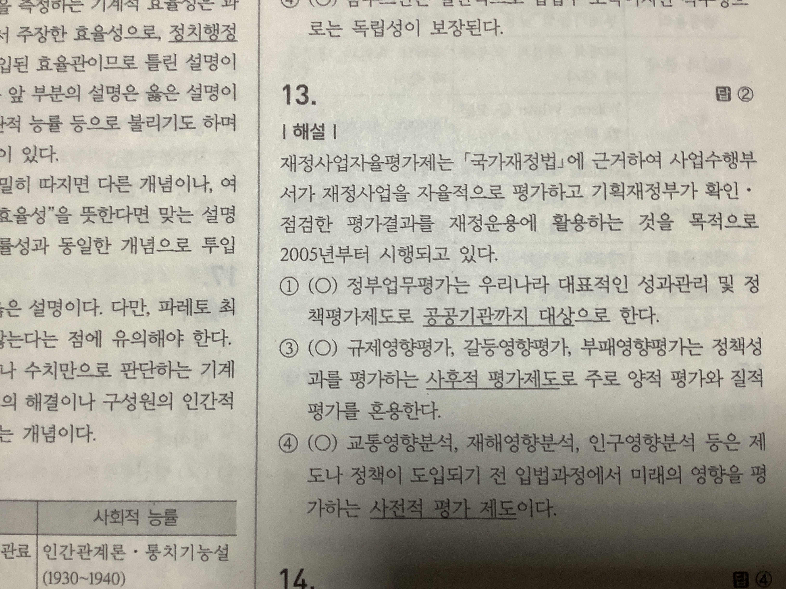문제 13번 옳은것을 고르는 문제인데 답은 2번인것은 알겠습니다. 그럼 나머지 지문들이 틀린 문장이여야하는데 해설을 보면 다른 선지들이 다 맞는 문장으로 되어있습니다. 3,4번 지문에서 교통영향분석, 재해영향분석, 인구영향분석은 사전적평가제도이다. 틀린문장이여야하는데 해설에서는 맞는 문장이라고 되어있는데 옳게 고치면 사후적 평가제도 바꿔야하는건가요 ? 갈등영향영평가, 규제영향평가, 부패영향평가는 사전적평가제도인가요 ?