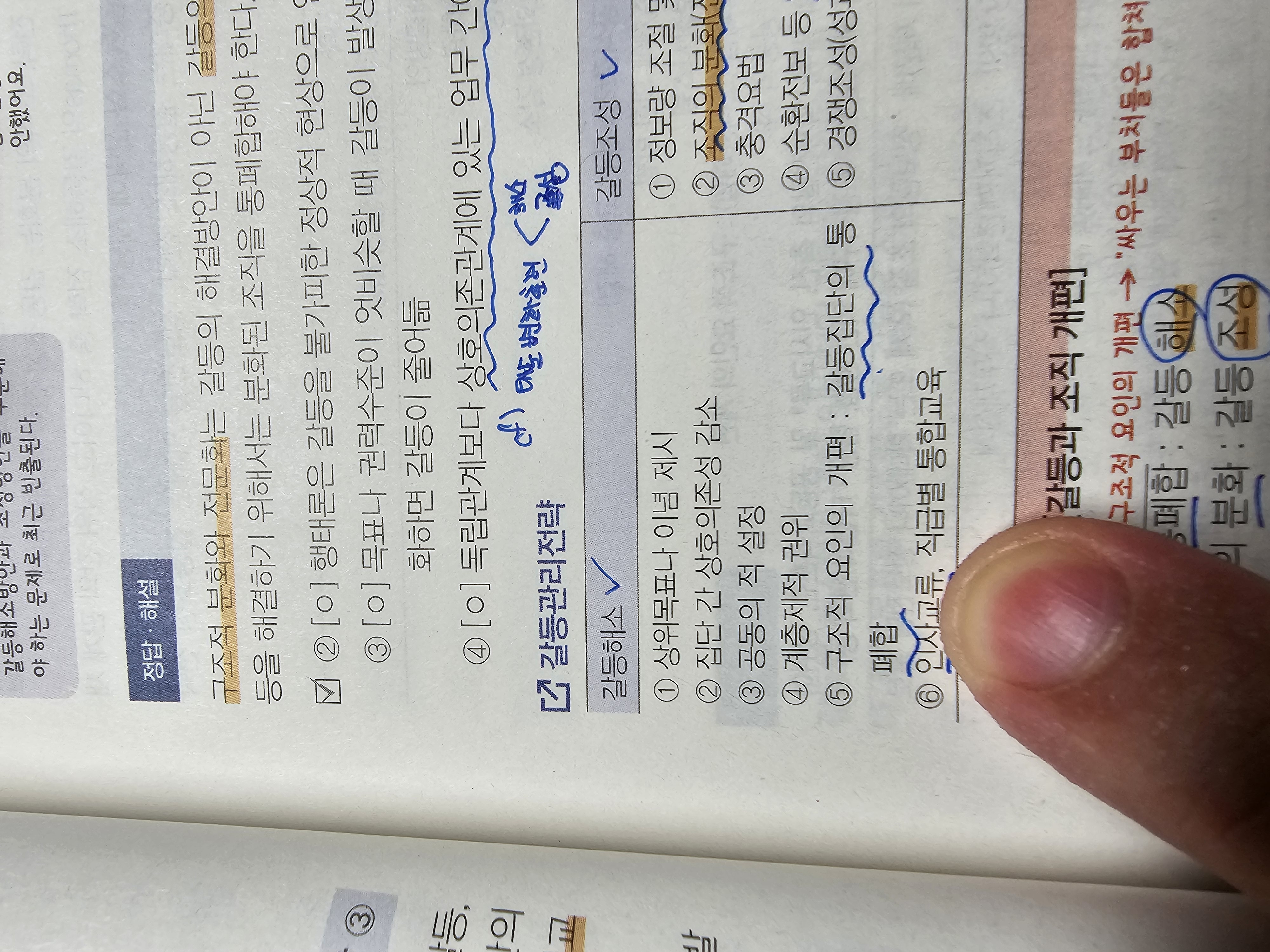 상기 갈등해소 전략 중 교수님 설명에서 인사교류와 인사이동 언급을 하시면서 둘은 같은거지만 해소전략, 조성전략이 될수도 있다고 하셨습니다. 단순히 암기하면 될 문제이지만 자꾸 제가 잘못이해한건지 해소전략에서의 인사교류는 단순 개인의 이동이 아닌 부서간 인사 상호교류를 뜻하는게 아닐까하는 생각이 맴도네요. 틀렸다면 지적해주시길 바랍니다. 감사합니다.