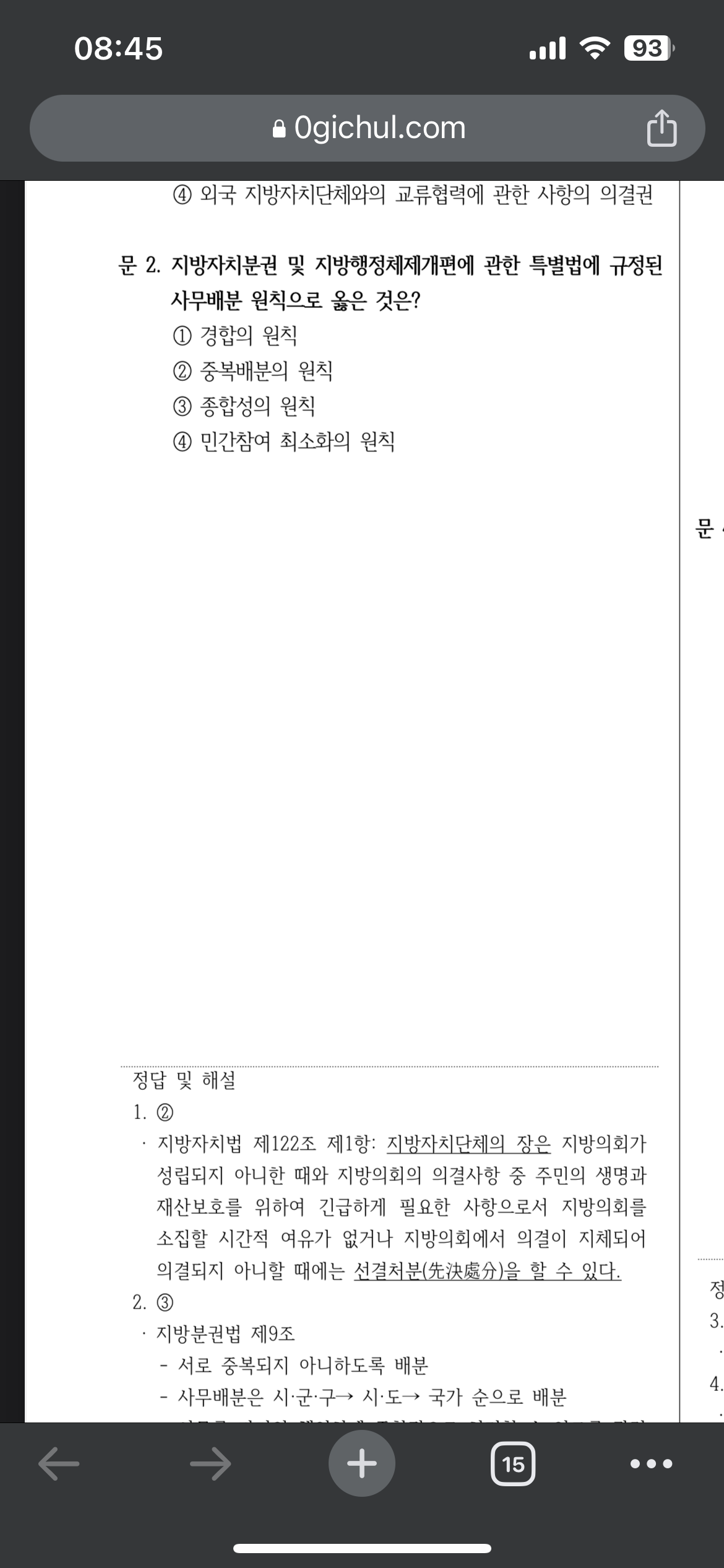 사무배분의 기본원칙 3가지는 중복배분금지의 원칙, 보충성의 원칙, 포괄성의 원칙이지만 문제에 따라 종합성의 원칙으로 해석되는 경우도 있습니다.